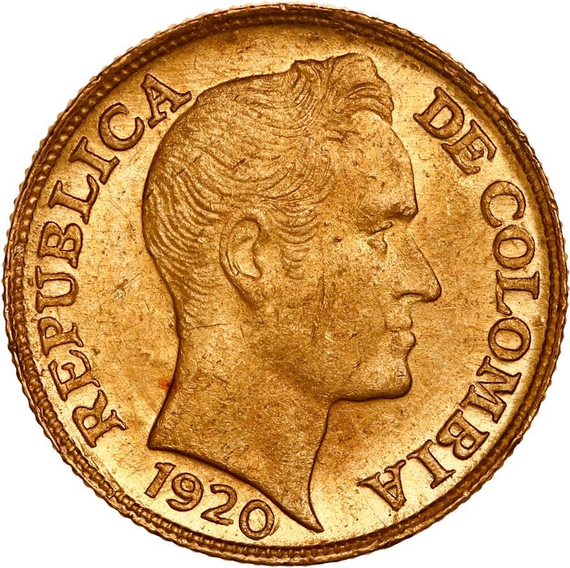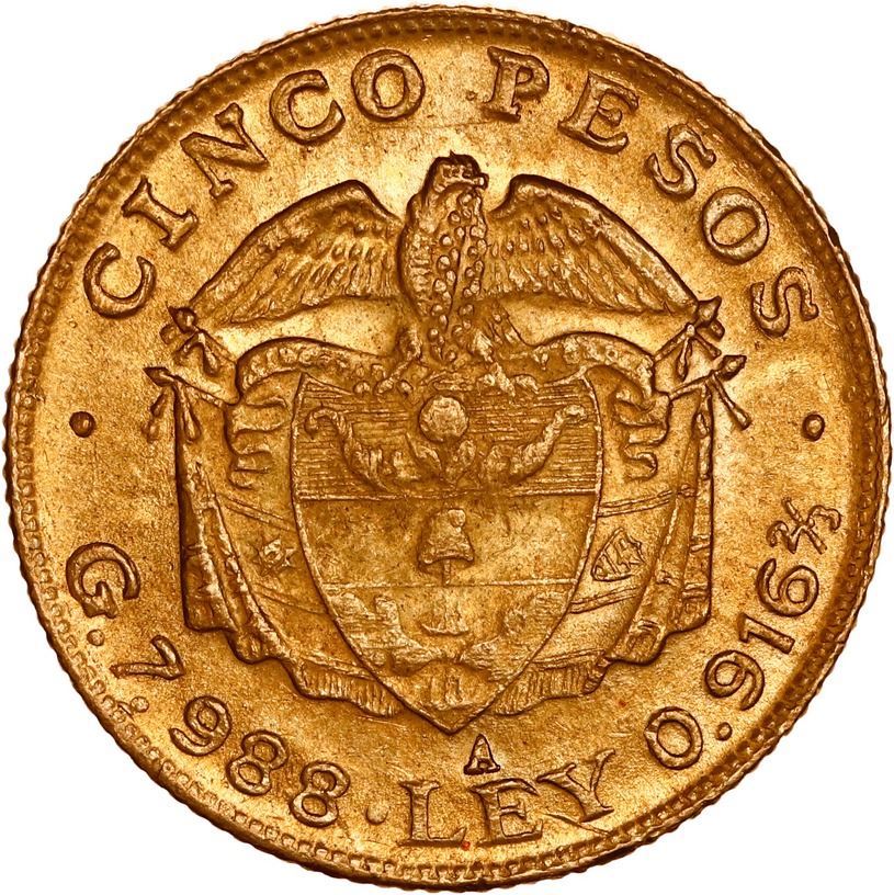 COLOMBIA, Medellín, gold 5 pesos, 1920, 20/20 in date, mintmark A to right, ex-JEAS.