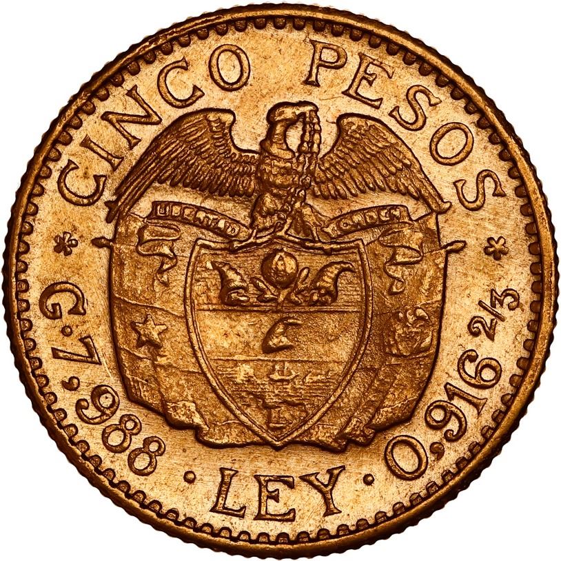 COLOMBIA, Medellín, gold 5 pesos, 1924, large 4 in date, ex-JEAS. Restrepo-455.2; Sed-54; Fr-115; KM-204. 7.95 grams. UNC with slightly grainy obverse, nicely lustrous reverse, light yellow color, AGW 0.2355 oz. Pedigreed to the JEAS Collection.