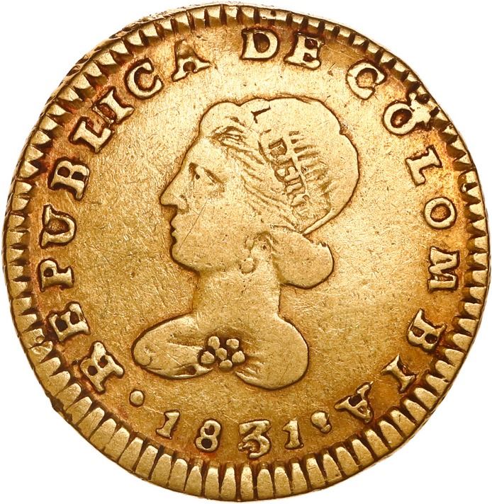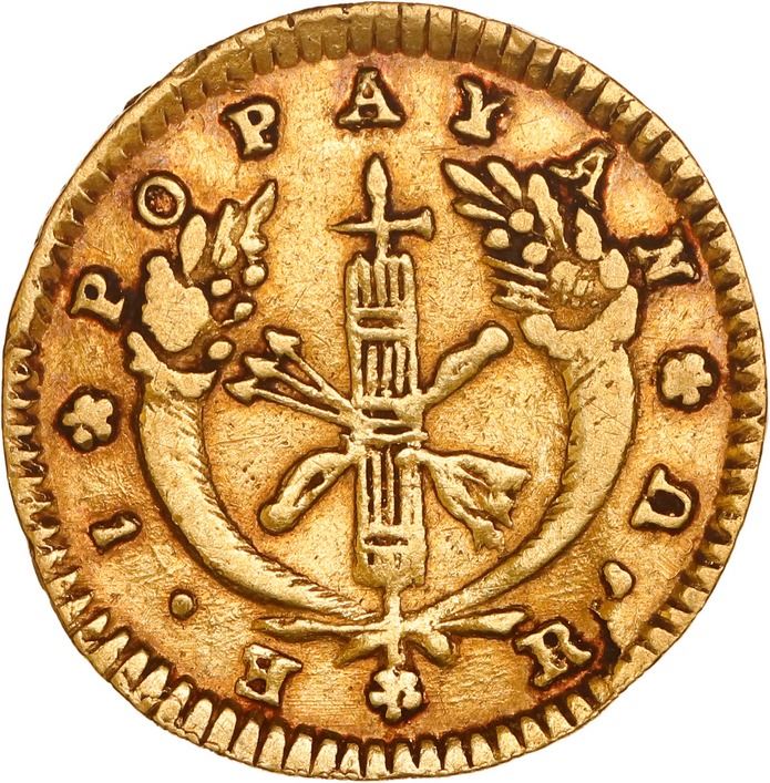 COLOMBIA, Popayán, gold 1 escudo, 1831 RU, inverted E in denomination, ex-JEAS. Restrepo-162.23; KM-81.2. 3.32 grams. VF, a few scattered hairlines, red toning around the edges. Pedigreed to the JEAS Collection.