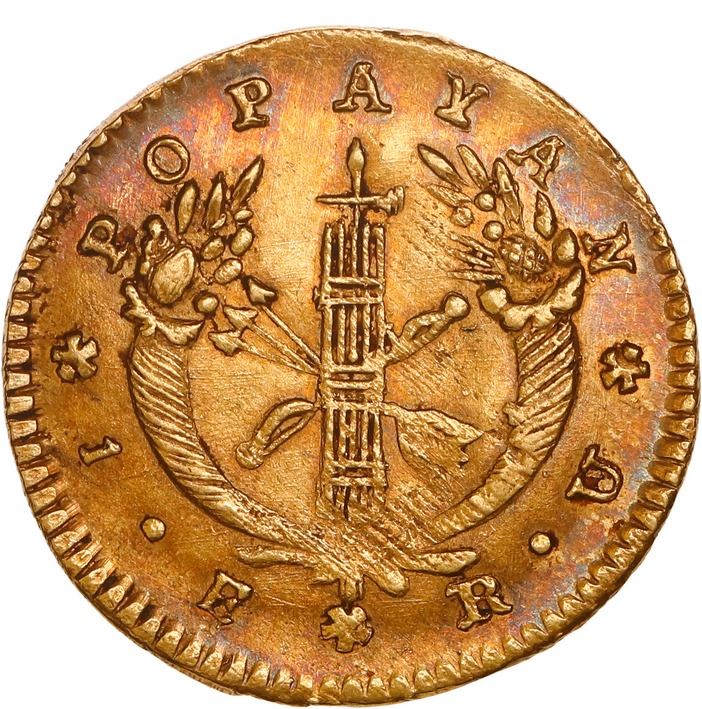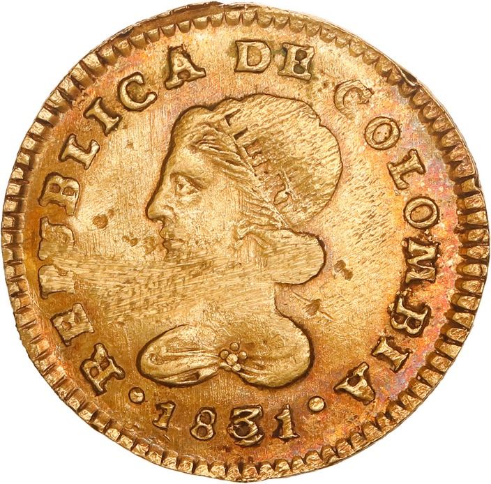COLOMBIA, Popayán, gold 1 escudo, 1831 RU, repunched 3 in date, ex-JEAS. Restrepo-unl (162 for type); KM-81.2. 3.53 grams. Interesting error with bold 3 repunched over at least one other 3. XF with large scrape on obverse. Pedigreed to the JEAS Collection.