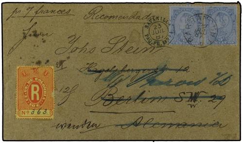 130+F8 1887 (July 23) Registered cover to BERLIN, readdressed on arrival, with 1886 5 c. blue (2) sharing BARRANQUILLA cds and 1883 Registration 10 c. red on yellow at left. Fine strike of octagonal SAVANILLA/PAQ. FR. D. Nº1 in blue (Salles 1505b/2). Arrival (AUG 20) on reverse.
