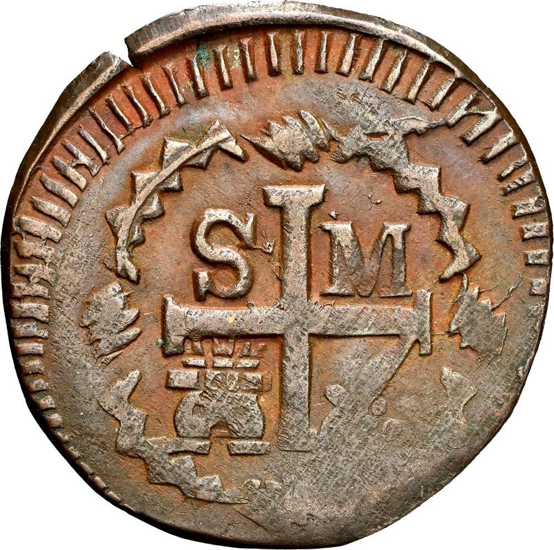 COLOMBIA, Santa Marta, copper ¼ real, Ferdinand VII, 1820, NGC AU 55 BN. Restrepo-104.1; KM-B4; Cal-119. Popular royalist necessity issue in copper only minted in 1820, struck slightly off-center yet with sharp details and glossy dark brown surfaces suggesting a higher grade.
