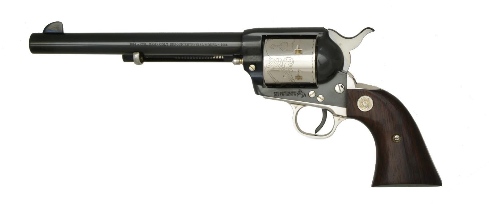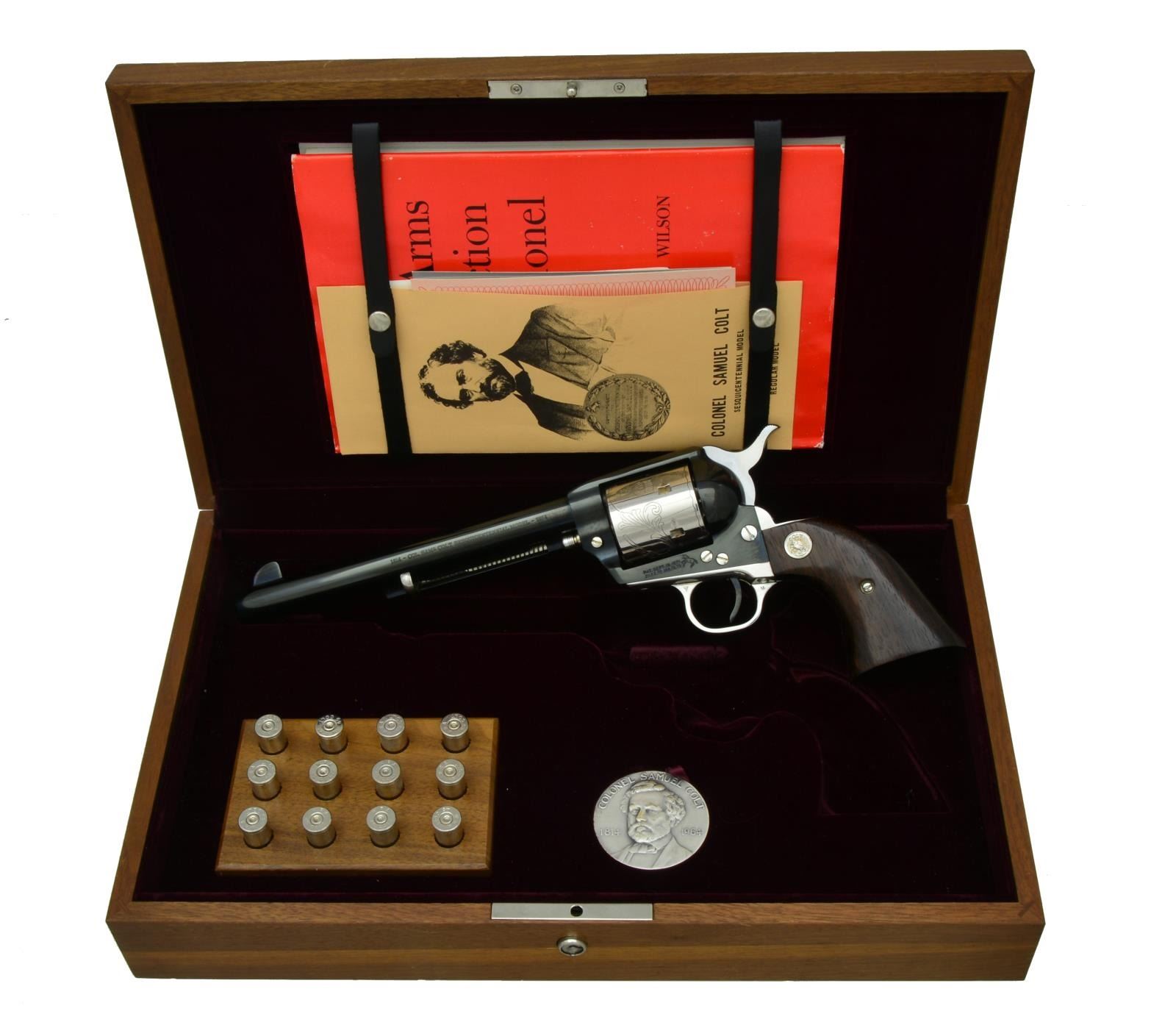 SECOND GEN COLT REVOLVER. Cal. 45 Colt. S# 3210SC. Bbl. 7 1/2" with blade sight. Left side of barrel is marked "1814 - COL. SAMl COLT SESQUICENTENNIAL MODEL - 1964". Nickel finished round 6 shot cylinder with special Sam Colt roll engraving. Blue finished with nickel finished grip straps, cylinder, cylinder pin, ejector head and action screws. Hammer sides are polished. 2 Piece rosewood grips with silver Rampant Colt medallions. 5,000 Produced in 1964. UNATTACHED ACCESSORIES: wood display box with burgundy velour fitted interior. Case lid has "1 OF 5000" sesquicentennial plaque. Box lid holds an R.L. Wilson book titled "The Arms Collection of Colonel Colt". Box interior contains wood cartridge block holding 12 nickel finished dummy rounds, case keys and Colonel Sam Colt medallion. Paperwork included consists of instruction brochure, care card, warranty card and congratulations letter. CONDITION: near new retaining over 99% finish showing a cyl. drag line. (22-5188/DS). CURIO. $1,750-2,500.