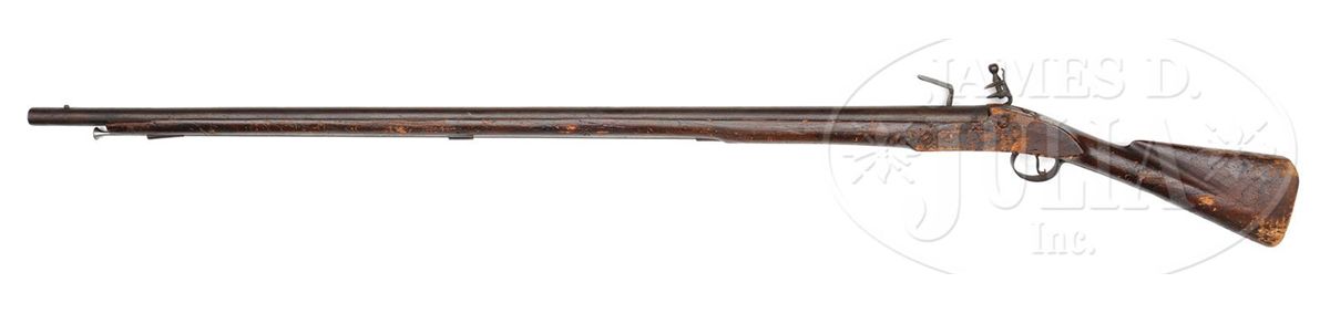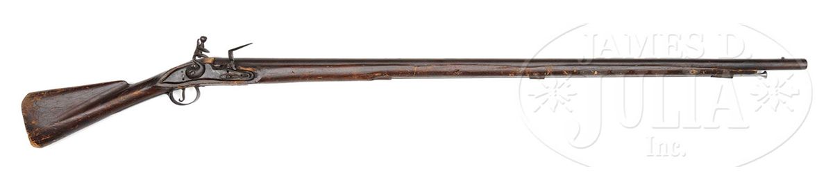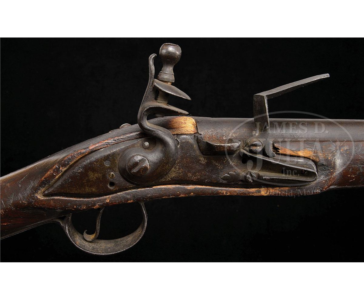 NSN. .80 Cal. x 45" long unmarked at breech with bayonet lug set back 1-1/2" from muzzle. Touch hole has been bushed. 7-1/8" long banana shaped lockplate unmarked under the unbridled pan. Brass furniture consists of 3 plain rammer pipes. Trigger guard is made of thin iron and lacks buttplate and sideplate. Stock is 56" long and has been missing a butt plate for many years. Overall the entire gun is of very crude workmanship. PROVENANCE: Collection of Dr. Douglas Sirkin. CONDITION: All iron work shows a rich dark patina. Pan area and touch hole has been burned through to inside of lockplate mortise. Stock has many deep scratches and gouges and loss of edges near the metal work and where butt plate should be. Ramrod is a modern replacement. 4-49823 PAS30