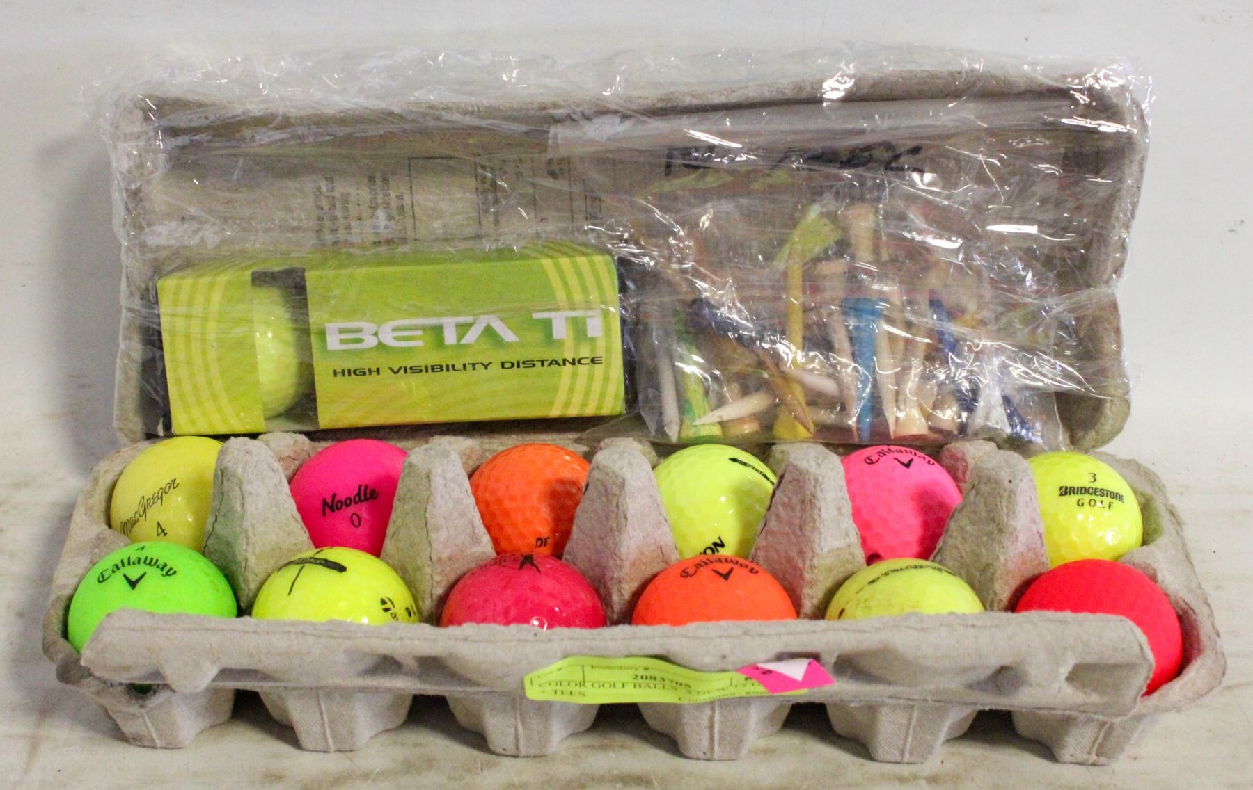 3 NEW + 12 USED COLOUR GOLF BALLS, 40+ USED TEES MIXED SIZES