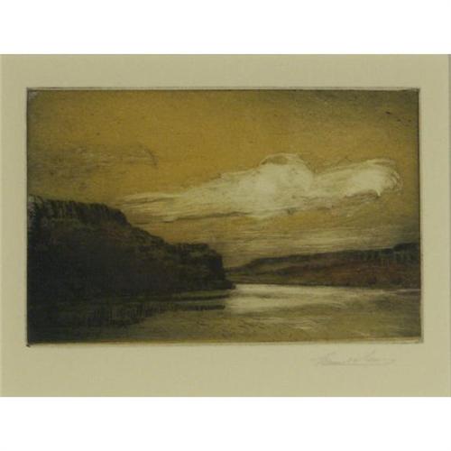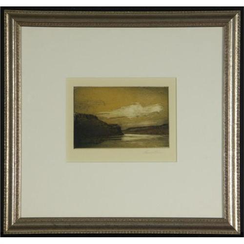 COLORED ETCHING, Thomas Wood (20/21st century), WA/CA. ''Columbia River below Cresent Bar''. Signed lower right. Titled and numbered 26/30 on the verso. Lisa Harris Gallery label on the verso. Matted and placed in a contemporary silvertone frame. More info. at the front desk. 4'' x 6''(plate size)/ 14'' x 14.5'' framed.