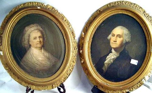 COLORED PRINTS; A pair of oval portraits depicting George and Martha Washington, the verso stamped with historical information, some wear