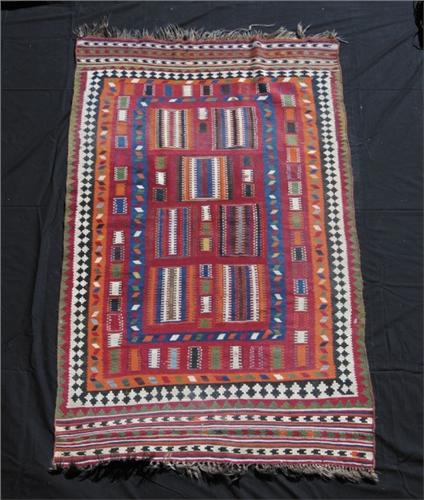 COLORFUL KELIM ORIENTAL RUG. The bright colors include orange, green, blue, ivory and red. Multiple borders with a red field and striped end. Last half of the 20th C. SIZE: 410in. x 811in.. CONDITION: Very good. 9-26071
