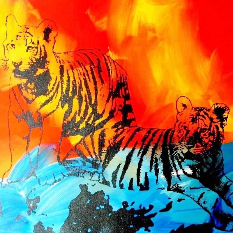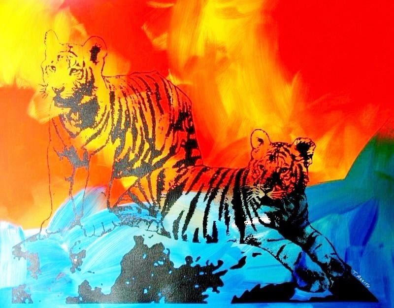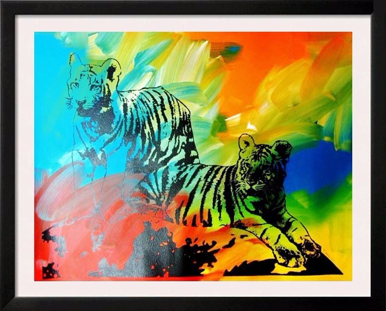 Artist: TONY AZZITO | Title of Art: TIGERS | Medium: HAND SIGNED ORIGINAL PAINTING WITH SILKSCREEN ON CANVAS | Edition Size: Original | Art Size: 30x37 | Offered Unframed. Framing Presentation are often shown for concept only. Read description: If framed, framed size will be given | Value: $ 1000