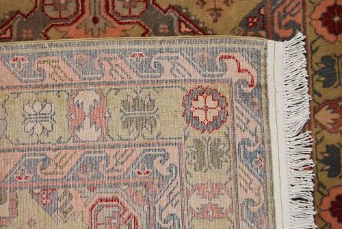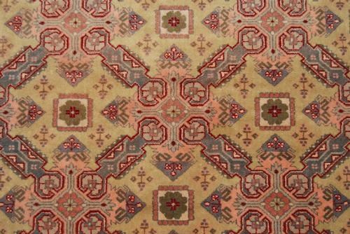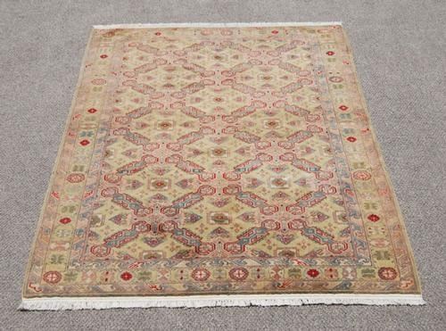 COLORFUL RARE ANTIQUE HANDMADE SHIRVAN DESIGN, SIZE 4.7 X 7.0 FEET, MADE OF FINE QUALITY WOOL PILE ON COTTON FOUNDATION. THE MULTIPLE REPEATED MEDALLION OF A SHIRVAN DESIGN OVER A BEIGE COLOR FRAMED BY A CONTRASTING BEIGE COLOR BORDER WITH A GEOMETRIC PATTERN. HAND WOVEN IN RUSSIAN.