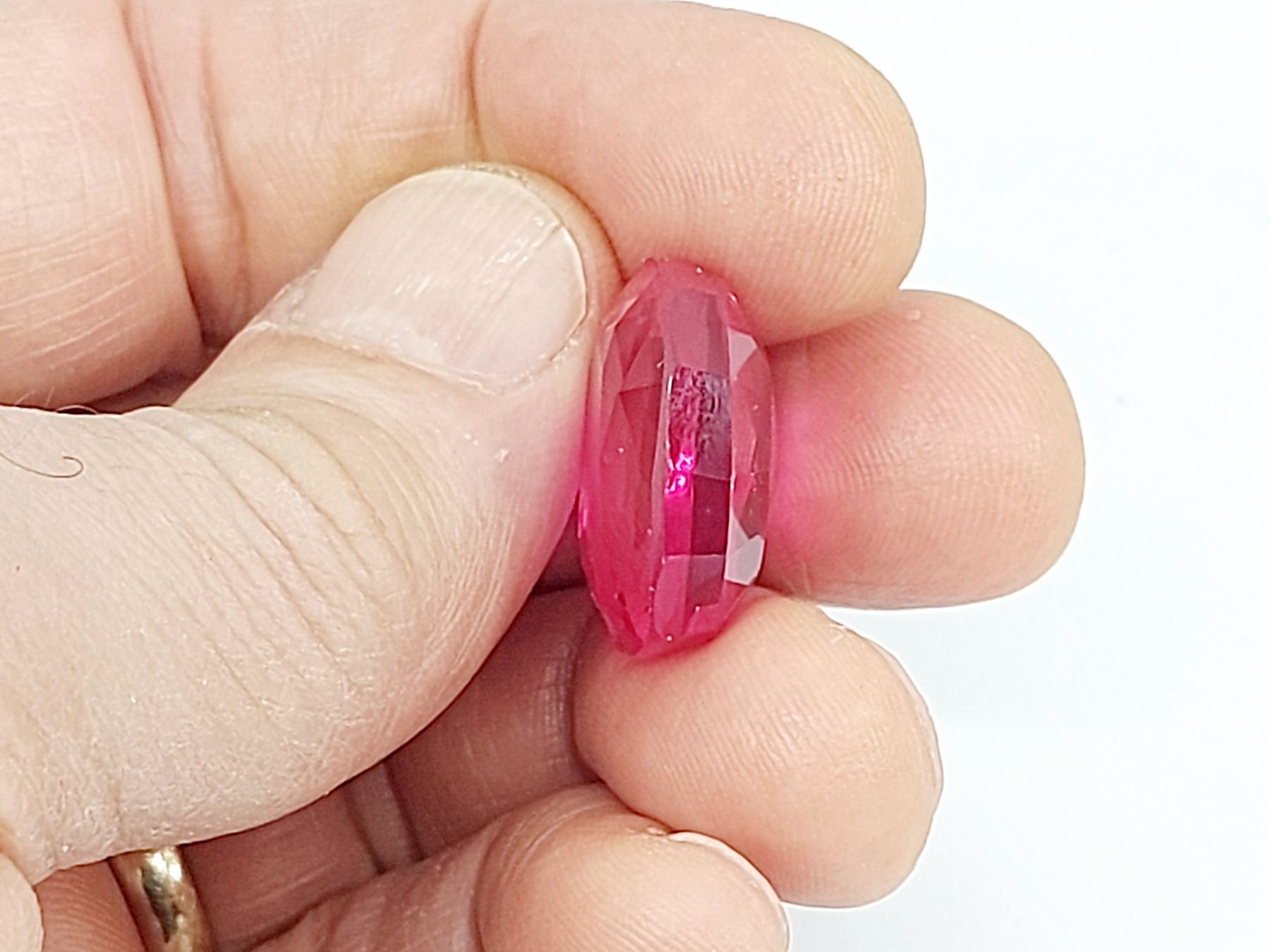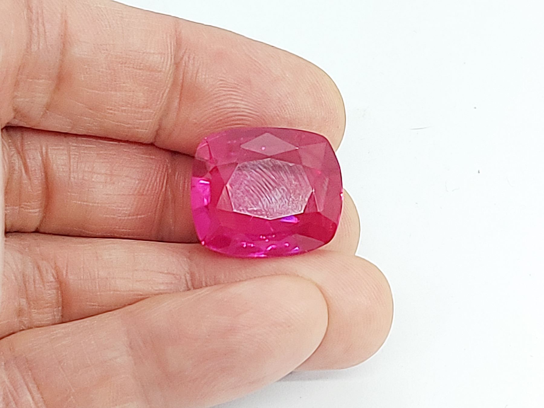 50.05 ct. 22.15 x 19.10 x 10.65 mm Colour: Pigeon Blood Red , Shape: Cushion Cut , Clarity: Loupe Clean Lab Created