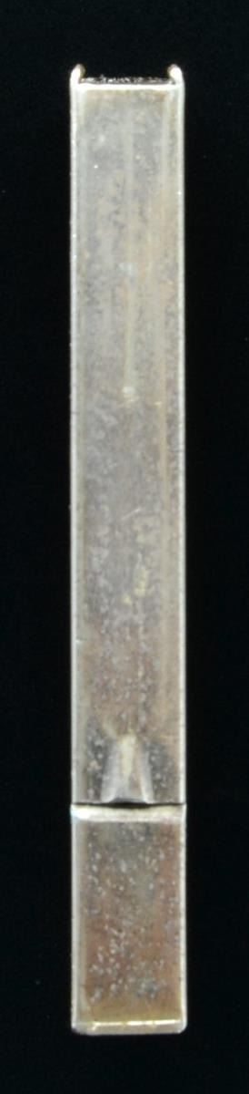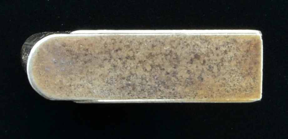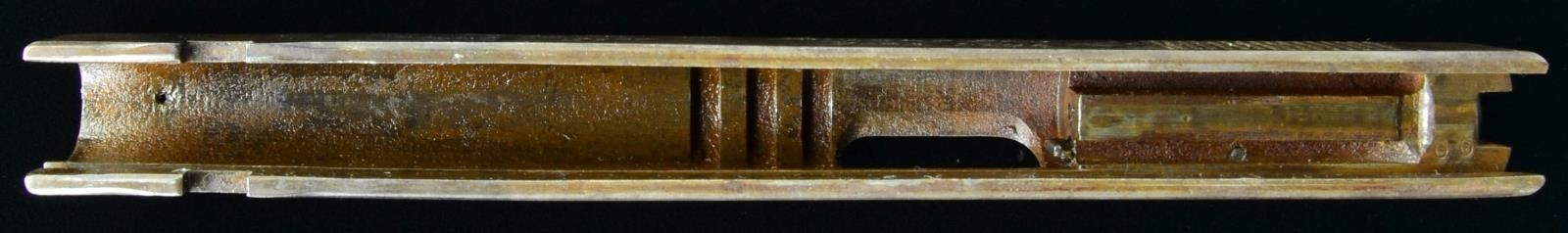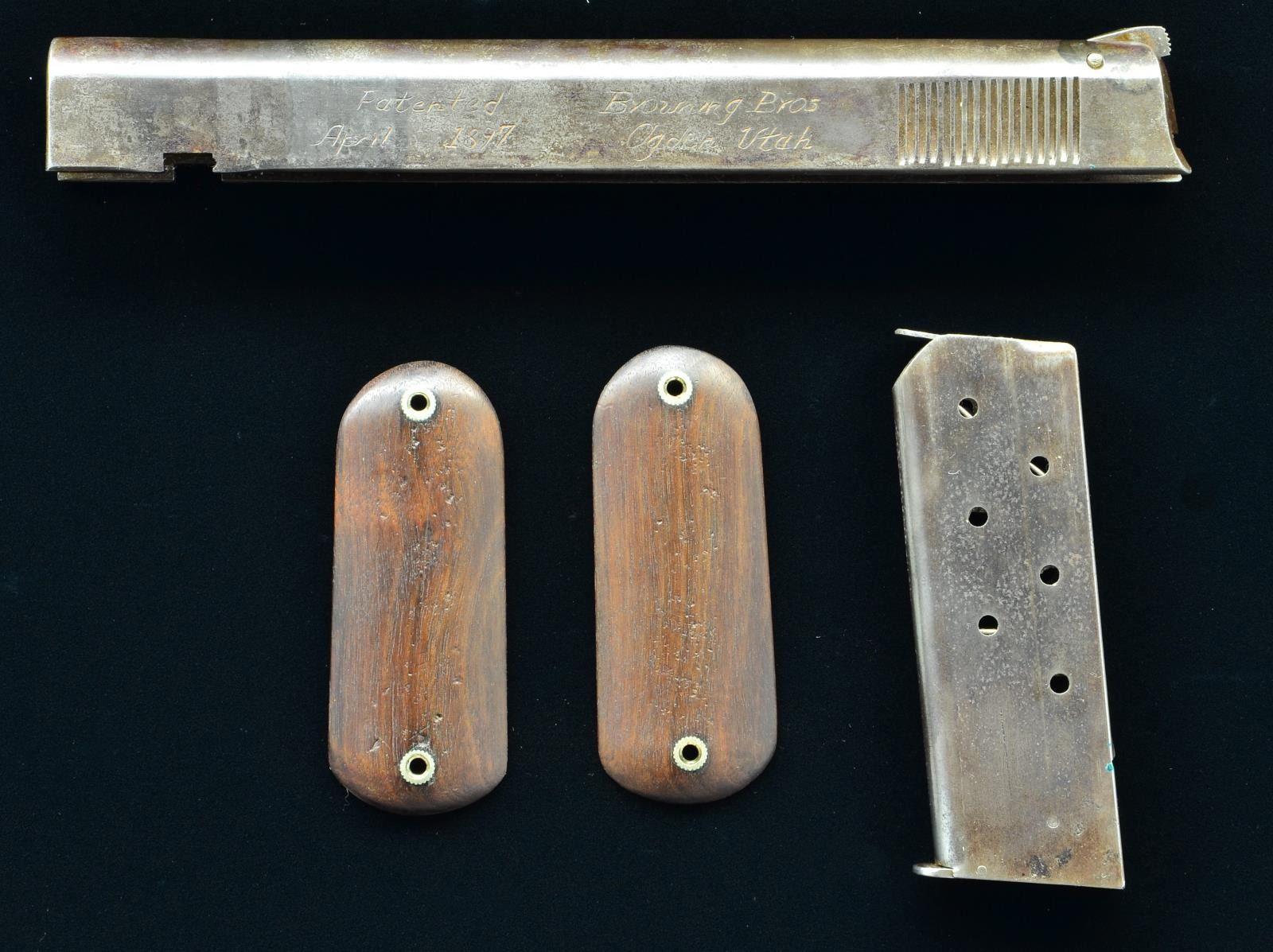 Extremely early Model 1900 Colt slide with hand engraved markings as found ONLY on the first 50 produced. The slide has an early rear sight / safety that was changed by mid 1901. The rear underside of the slide is numbered "00". The slide serrations are machine cut (not uniform); appears individually done by machine using an operator controlled spacing & length. Also, serrations are slots rather than angled grooves as is common on most pistols. The Model 1900 in the then new 38 Rimless caliber was Colt's first semi-auto pistol. Manufacturing was from 1900 to 1903 and limited to just 3,500 units of which 50 went to the Navy plus 200 to the Army. The slide's finish is a cleaned patina appearance over aged light pitting. The hand engraving on the slide is very clear. The slide is complete except for missing its front sight blade. The grips are smooth walnut (used until mid 1900 when hard rubber became standard) having an oil finish & light handling marks; overall very good. The 7 round magazines had an 1884 patent date on their bases, but this original magazine is not marked. The sides of the magazine have significant cleaned prior pitting plus a very light dent at bottom of the left side. The latch area has a raised detent in addition to its cross slot. This is a very early package that may even be from the prototype Model 1900 given all the details such as "00" on the slide having irregular cocking grooves. (02-17437-5/NW). $1,000-3,000.