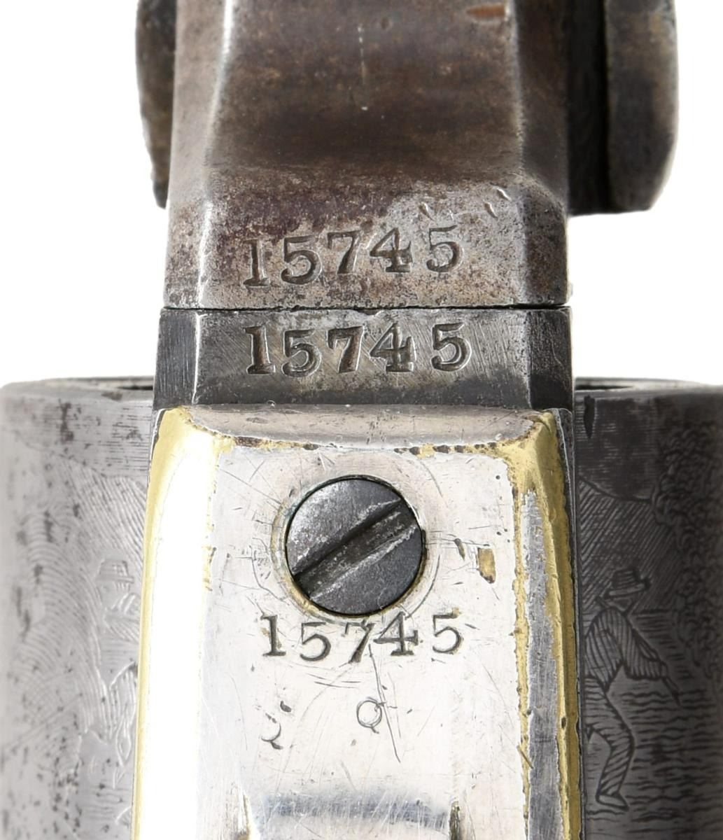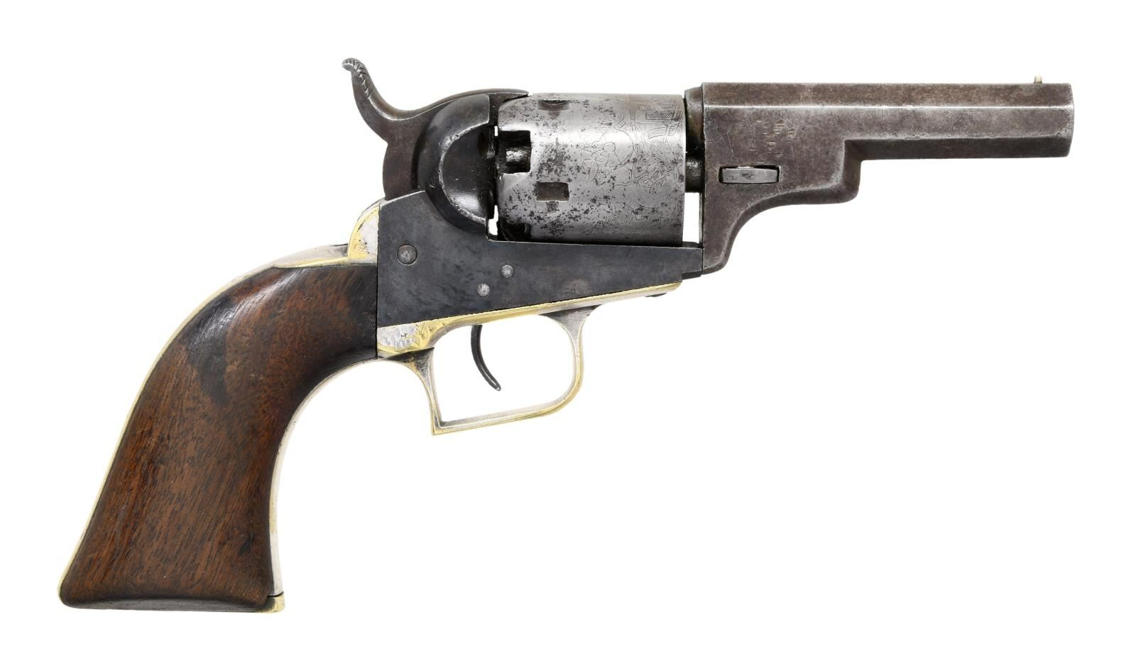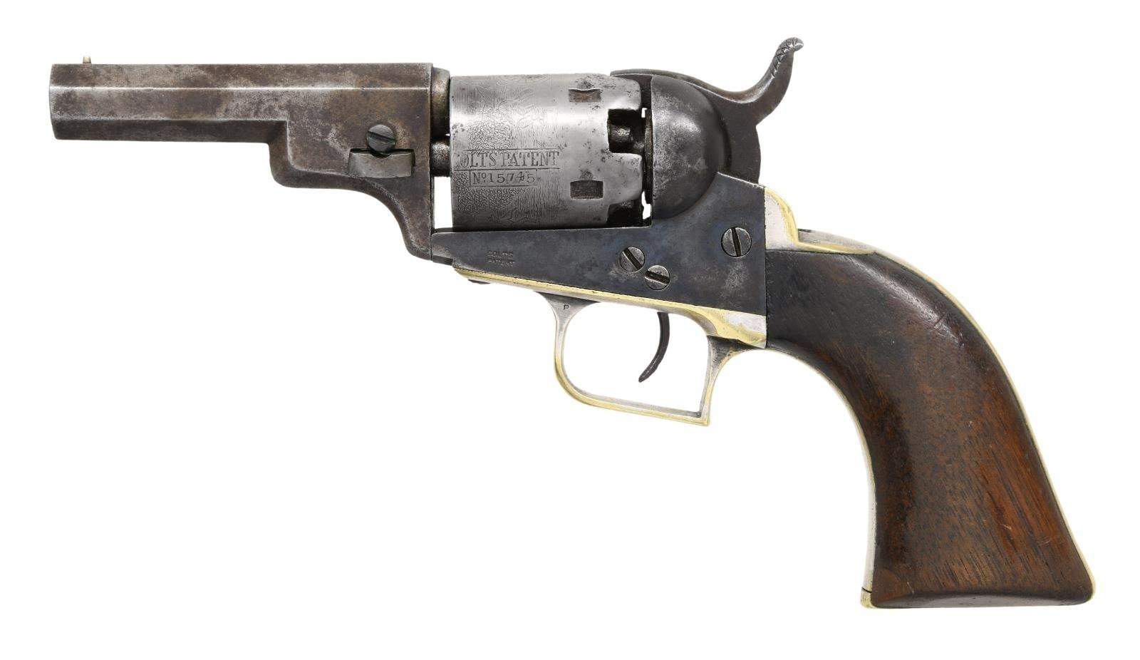 Cal. 31. S# 15745. Bbl. 3" octagon w/ New York address & brass comb sight. Made w/o loading lever. Five shot round cyl. w/ stagecoach scene roll engraving. Blue & case colored finish w/ silver finished brass backstrap & square back trigger guard. Bbl., frame, grip straps & wedge have matching numbers. 1 piece walnut grips. Approx. 15,000 mfg. 1847-50. This revolver was mfg. 1850. CONDITION: bbl. finish has faded to gray-brown w/ series of dents in right wedge area. Cyl. has cleaned gray appearance showing scattered pitting & retaining most of its scene. Frame has a dark faded appearance w/ faint traces of case colors. Grip straps show 40% silver finish w/ marks & small dents. Grips show heavy wear w/ chip at toe of right panel. Action shows wear. Lightly pitted bore retains sound rifling. (01-24815/DS). ANTIQUE. $3,500-5,000.