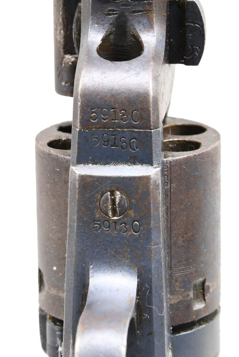 Cal. 38 CF. S# 59130. Bbl. 7 1/2" octagon w/ New York address. Brass cone style front sight. Ejector housing is fitted to right side of bbl. Six shot round cyl. w/ naval scene roll engraving. Iron grip straps. Full blue finish. Butt of gun is stamped "U. S. N." over inspector's initials "J.L.H.". Left side of frame has 1871 & 1872 patent dates. 1 piece walnut grip. Total of about 3,800 converted in the mid 1870s. CONDITION: 60% dull blue fading to brown showing spots of corrosion. Cyl. has weakly visible scene. Grips are age darkened w/ heavy wear, dents & handling marks. Hammer will not hold in full cock position. Bore is generally bright retaining strong rifling. (01-25162/DS). ANTIQUE. $2,250-3,000.