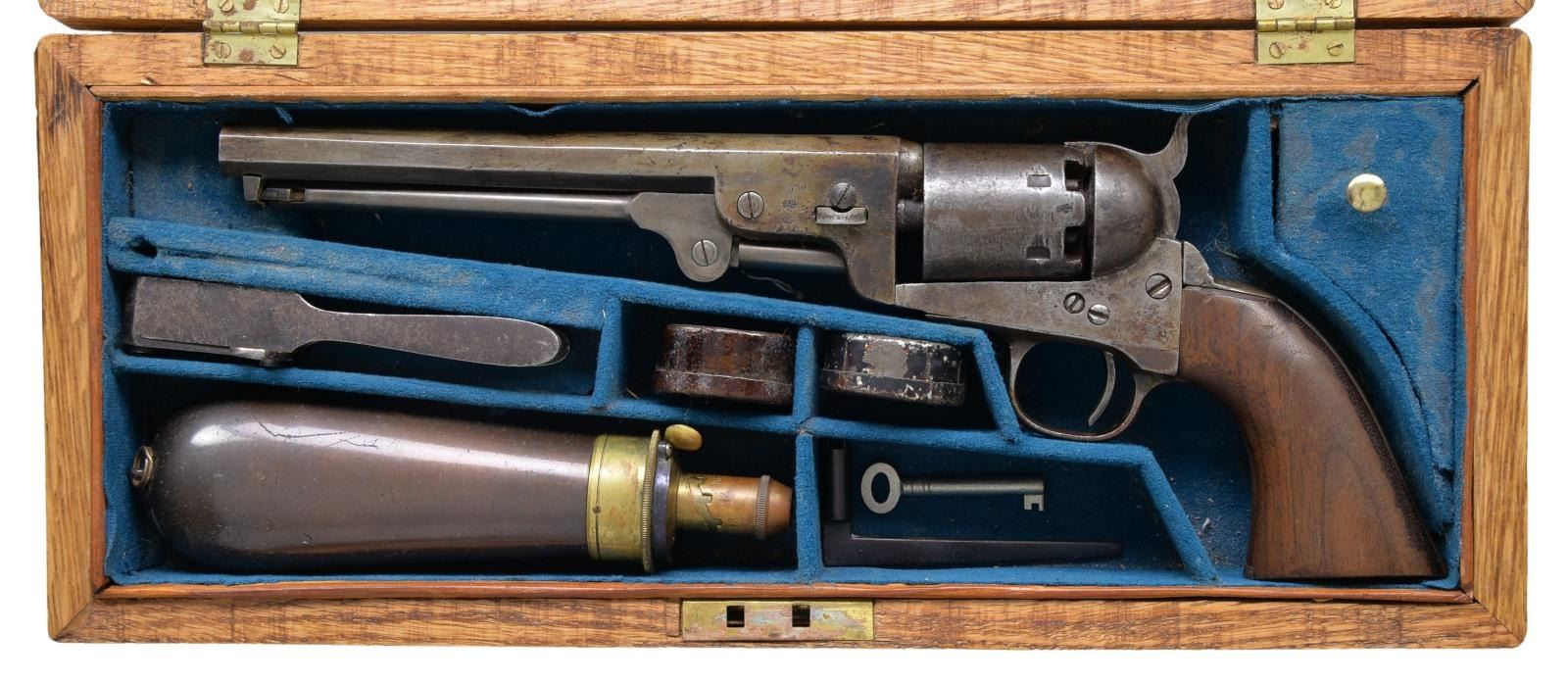 Cal. 36. S# 100521. Bbl. 7 1/2" w/ New York address. 6 Shot rnd. roll engraved cyl. Cyl. & left side of bbl. flat have British proof marks. Bbl., frame, trigger guard & cyl. have matching numbers. Wedge & back strap are unmarked. Iron grip straps w/ lg. trigger guard. 1 Piece walnut replacement grip. UNATTACHED ACCESSORIES: modern wood box w/ fitted interior containing powder flask, 2 cavity bullet mold, nipple wrench, case key & 2 Eley Bros. cap tins. CONDITION: metal has a mottled gray brown appearance from touch up finish showing file marks, dents & spots of pitting. Front sight is removed. Grips have a poor fit & show grinding marks. Hammer has worn cocking notches. Action is loose & cyl. is not properly timed. Dark pitted bore w/ rifling removed. (01-18428/DS). ANTIQUE. $700-1,100.