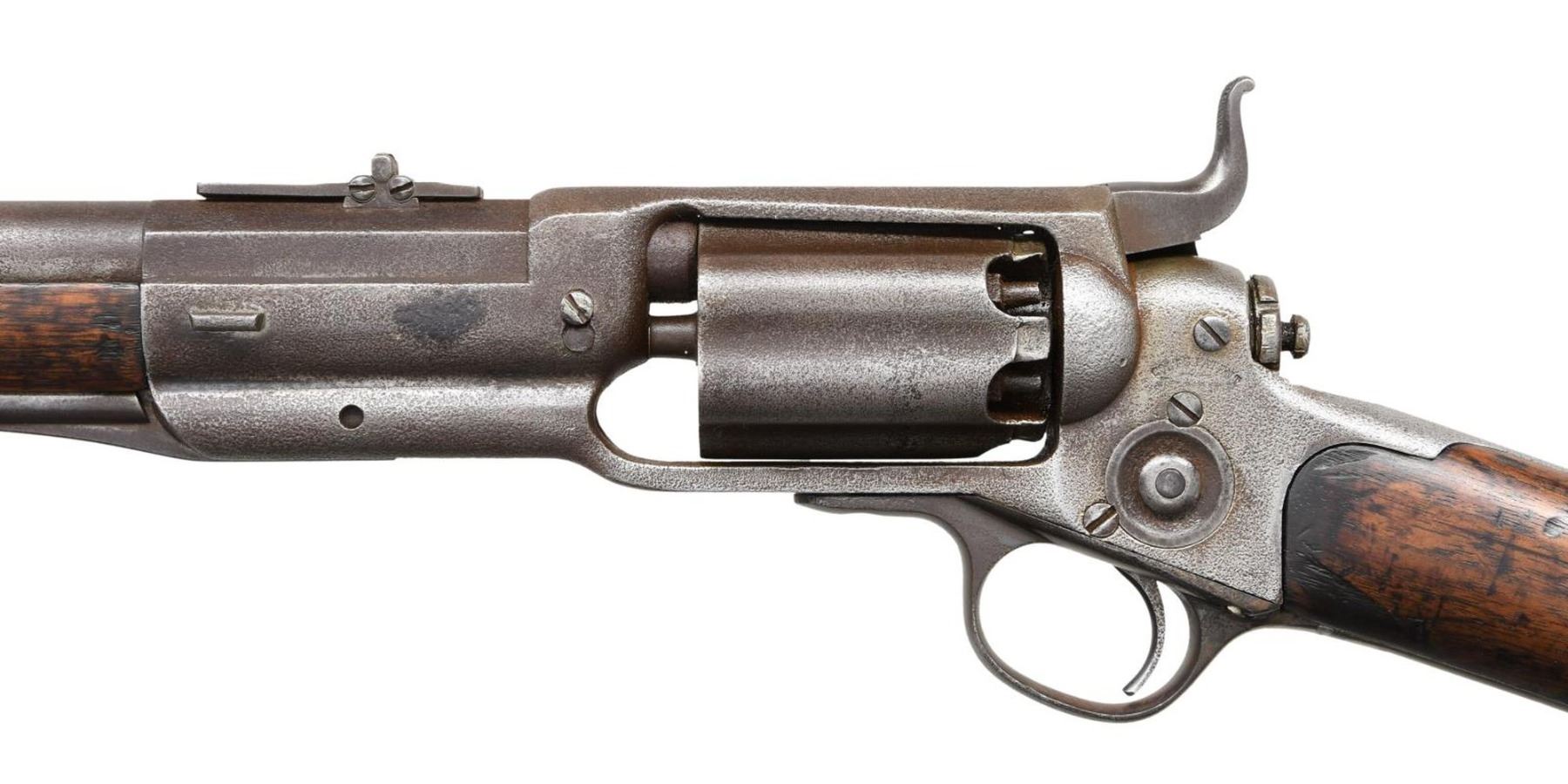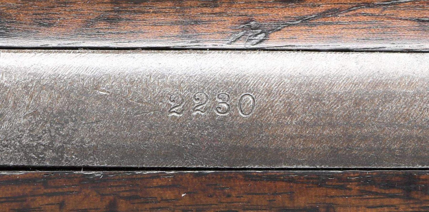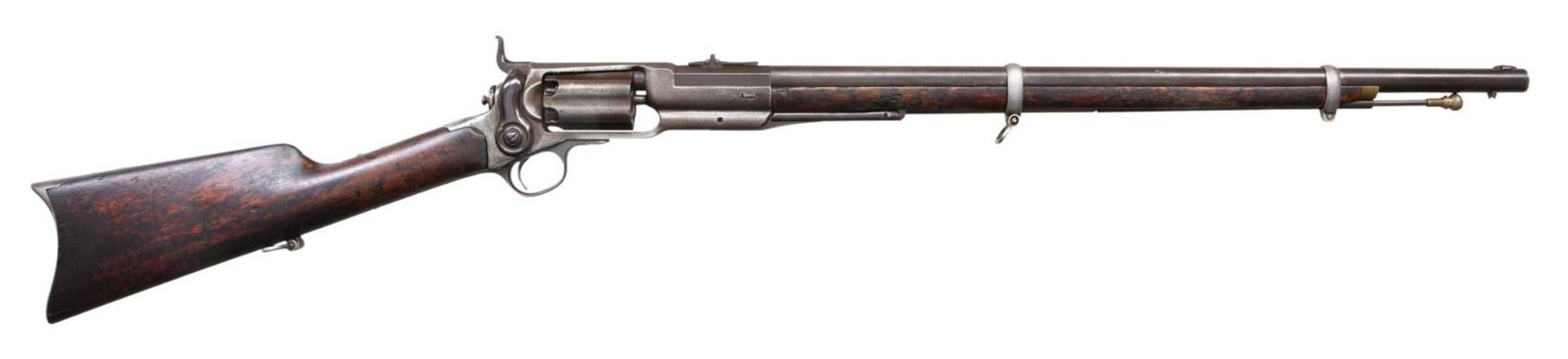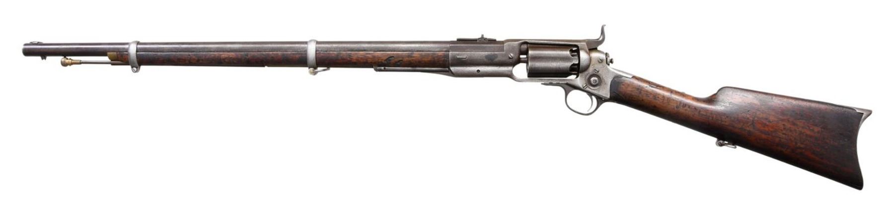 Cal. 44. S# 2230. Estimated total of 9,310 mfg. 1856-64. Approx. 4,400 were purchased by the US government. This rifle is not US marked. Bbl. 27" round w/ lug for saber bayonet. German silver blade front sight w/ 2 leaf rear sight. Six shot fully fluted cyl. 2 band fastened walnut stock w/ brass forend tip & straight grip stock having crescent steel buttplate & sling swivels. Brass tipped ramrod. UNATTACHED ACCESSORIES: J. M. Davis Museum inventory tag & catalogue clipping. CONDITION: frame, cyl. & bbl. bands show general pitting. Bbl., trigger guard, buttplate & other fittings have a faded brown appearance w/ some light pitting. Wood has worn finish w/ age darkening showing numerous scratches, marks & dents. Lower tang shows evidence of a welded repair. Ramrod tube is broken between the bbl. bands. Action does not lock securely on all chambers. Dark lightly pitted bore retains strong rifling. PROVENANCE: rifle is fitted w/ brass tag no. "8895" identifying it to the J. M. Davis Memorial Arms & Historical Museum in Claremore, Oklahoma. Catalogue clipping shows this rifle as lot no. "40138" sold at auction to benefit the museum. (01-24832/DS). ANTIQUE. $3,000-5,000.