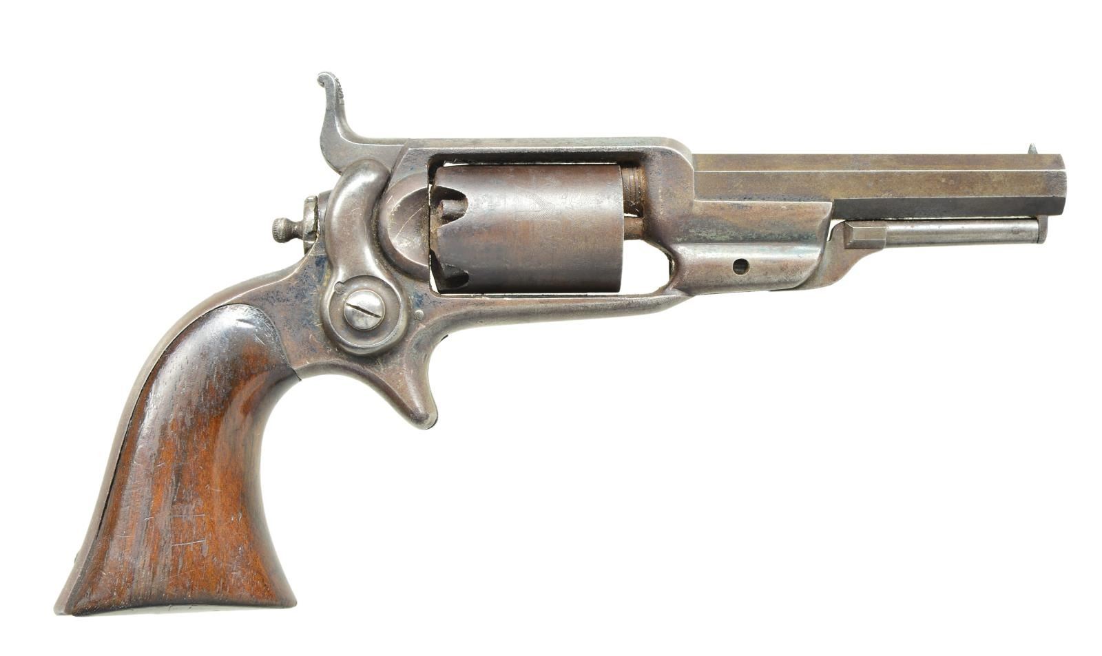 Cal. 28. S# 25021. Bbl. 3 1/2" octagon. 5 Shot round roll engraved cylinder. Solid frame spur trigger action with right side mounted hammer and rear entry cylinder pin. 1 Piece wraparound walnut grip. Approx 40,000 mfg. 1855-1870, this one mfg. 1860. CONDITION: metal has faded to brown patina showing spotty surface corrosion. Grips show moderate wear and handling marks. Lightly pitted bore retains sound rifling. 01-21424/DS). ANTIQUE. $500-700.