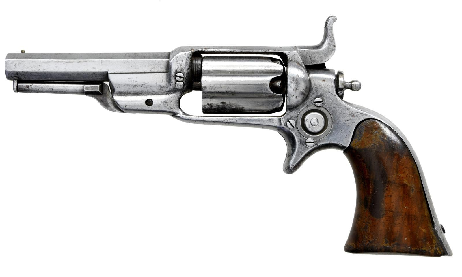 Cal. 31. S# 1451. Bbl. 3 1/2" octagon w/ Hartford address. Full fluted cylinder, one piece wrap around wooden grips & matching S#s on butt & bottom of Bbl. flat. CONDITION: Action does not work. Hammer holds on half & full cock but cylinder does not advance. Cylinder spins freely w/ hammer down. Metal is a gunmetal patina; aggressively cleaned leaving fine to light scattered pitting throughout. Grips appear to be original but fit poorly. Butt screw is a hardware store replacement. Bore is poor; faint but visible rifling & moderate rust throughout. (01-23523/CW). ANTIQUE. $400-600.