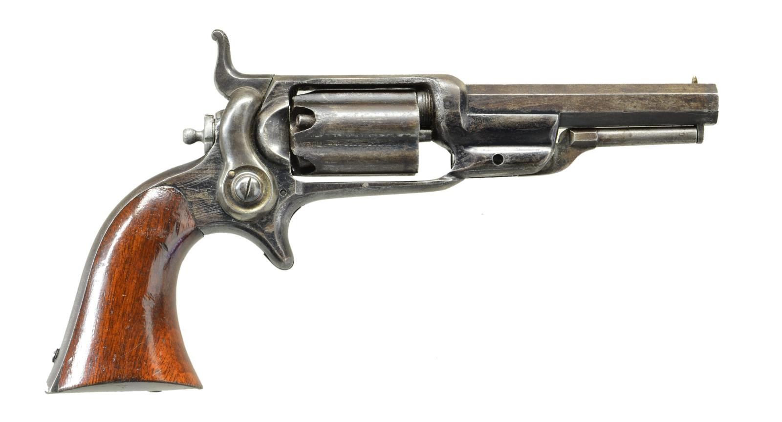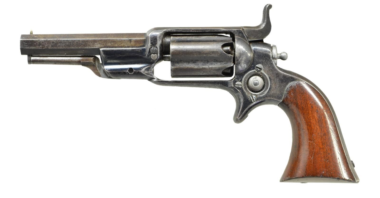 Cal. 31. S# 1973. Bbl. 3 1/2" octagon with cone sight and 2 line Hartford address without pointing hand motif. Full fluted 5 shot cylinder. Blue finish with case colored hammer. 1 Piece walnut grips. Mfg. 1861. CONDITION: very fine. Over 40% original blue fading to brown patina and showing light dents and marks. Hammer has lightly visible case colors. Grip has good original finish showing scattered handling marks with small chip at toe of right panel. Sound action. Bore retains strong rifling showing small spots of light pitting. (01-21700/DS). ANTIQUE. $1,200-1,800.