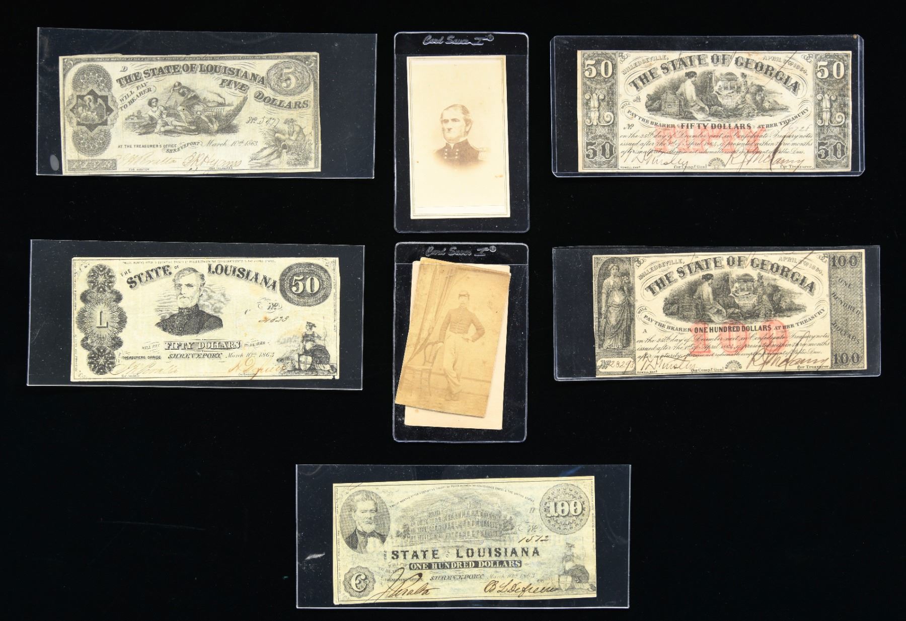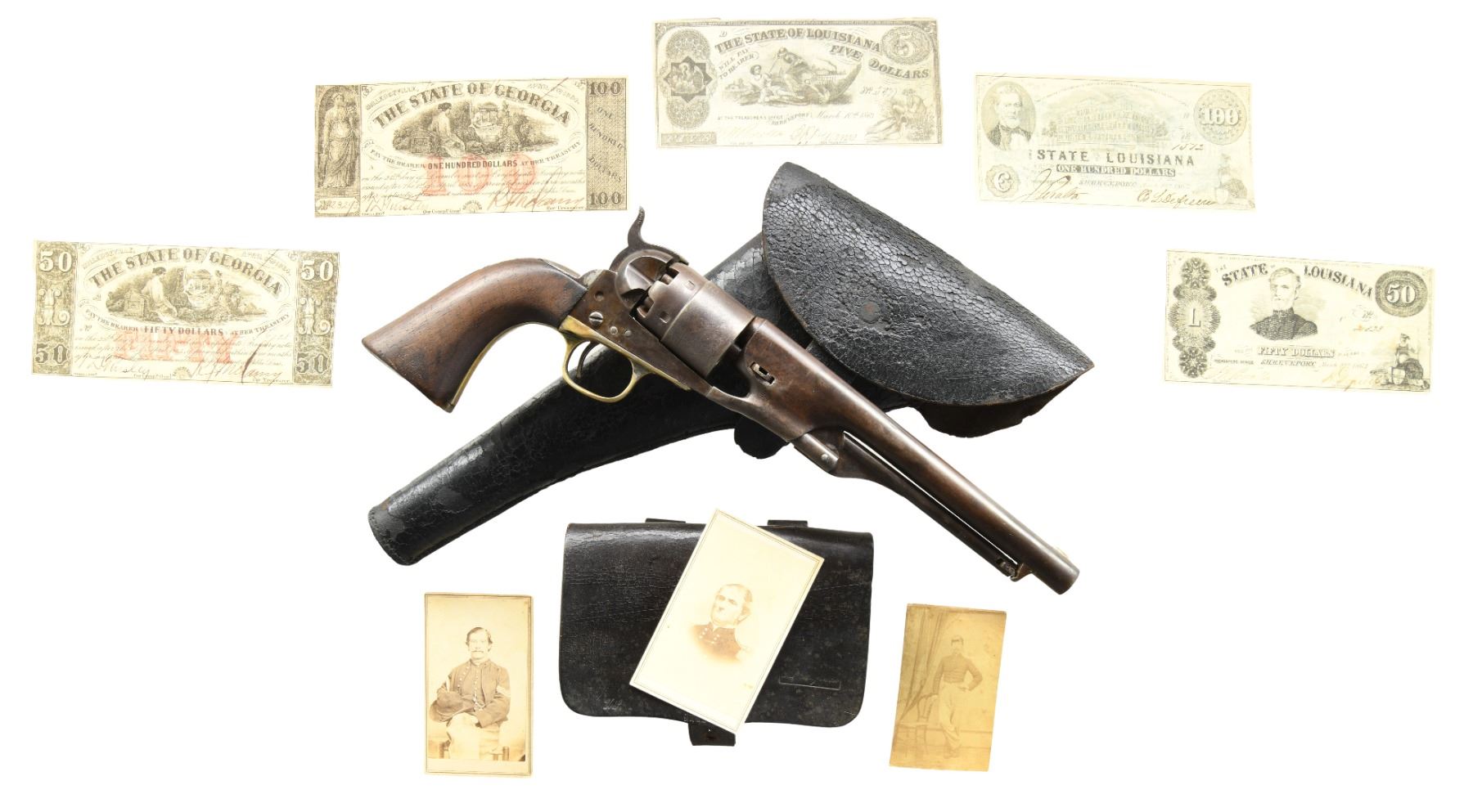 Cal. 44. S# 19886. Bbl. 8" round w/ New York address. Six shot round rebated cyl. w/ naval engagement scene engraving. 4 screw action w/ shoulder stock attachment provisions. Original finish was blue & case colored w/ silver finished trigger guard. Bbl., frame, grip straps & cyl. have matching numbers. Shortened wedge is unnumbered. 1 piece walnut grip, both panels have partially visible cartouches. Mfg. 1861. UNATTACHED ACCESSORIES: leather flap holster in fair condition. Leather cartridge box in good condition. Six rd package of Hazard Powder Co. 44 cal. cartridges. Package is opened. Cartridges are in fair condition. Confederate States paper currency includes 1 each of the following bills: State of Georgia bills in $50 & $100 denominations & State of Louisiana bills in $5, $50 & $100 denominations. All bills are in very good condition. 3 photographs of uniformed civil war soldiers, 1 is labeled "Brigadier-General Polk, C.S.A.". Second photo is labeled "Private / Cavalry". 3rd photo is unlabeled. Consignor states: "The revolver, holster, banknotes belonged to a Maine cavalryman, "Thibodeaux" and 2 CDVs of him as private and later as sergeant, an older, well trooper. A cdv of Confederate general Leonidas Polk, a souvenir from when he was killed in 1864 during Sherman's advance on Atlanta. The 5 Confederate state bills: $50 Georgia #6728; $100 Georgia #23293; $5 Louisiana, #5977, propaganda South strikes down Union; $50 Louisiana #4823, honoring Polk; $100 Louisiana, # 1512, depicting the "new, planned" state capitol, the original having been destroyed by the 2nd Maine cavalry. The cdv and notes, are souvenirs collected by Thibodeaux at Polk's headquarters, June 14, 1864, Pine Mountain, Marietta, Georgia.". CONDITION: metal has a smooth brown faded appearance w/ small dents in wedge area. Trigger guard shows small amounts of silver finish. Grips show heavy wear w/ chips having added wood repairs at butt. Functioning action has weak spring tension. Pitted bore retains intact rifling. (01-25756/DS). ANTIQUE. $2,500-3,000.