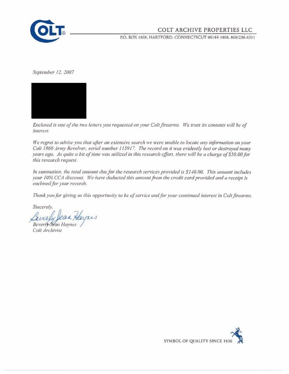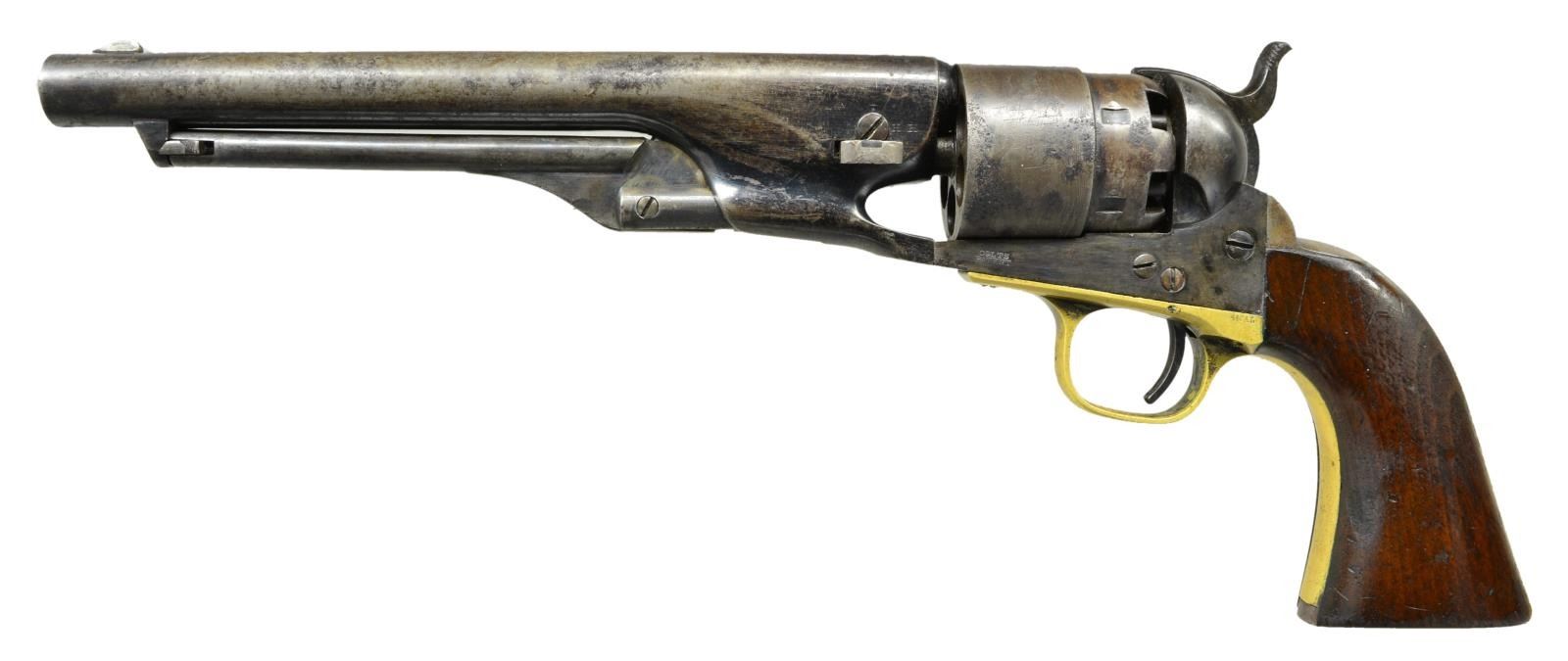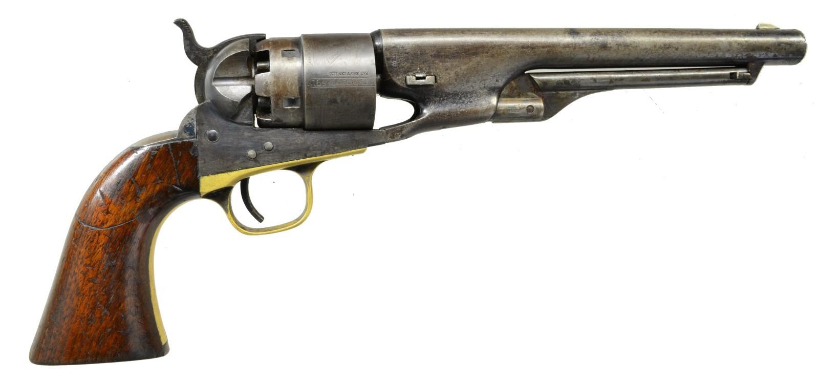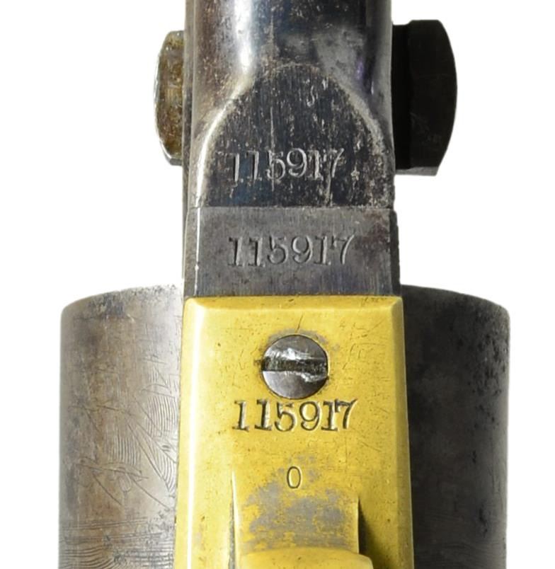 Cal. 44. S# 115917. Bbl. 8" round with German silver blade sight and New York address. Round rebated 6 shot roll engraved cylinder. Action has provisions for shoulder stock attachment. Blue and case colored finish with silver finished brass trigger guard. 1 Piece walnut grip. Barrel, frame, grip straps, cylinder and wedge have matching numbers. Left barrel flat has "NH" inspectors mark. Trigger guard has "O" inspectors mark. 1 Piece walnut grip. Mfg. 1863. CONDITION: barrel retains 30% blue in protected areas with balance fading to gray showing spotted corrosion. Cylinder has dark faded finish with spots of pitting. Frame shows significant case colors on sides. Trigger guard retains traces of silver finish in protected areas only. Grips have worn finish with numerous dents, scratches and marks. Action is tight and functioning. Bore is generally bright with strong gain twist rifling showing small darkened spots. (01-21599/DS). ANTIQUE. $2,250-3,000.