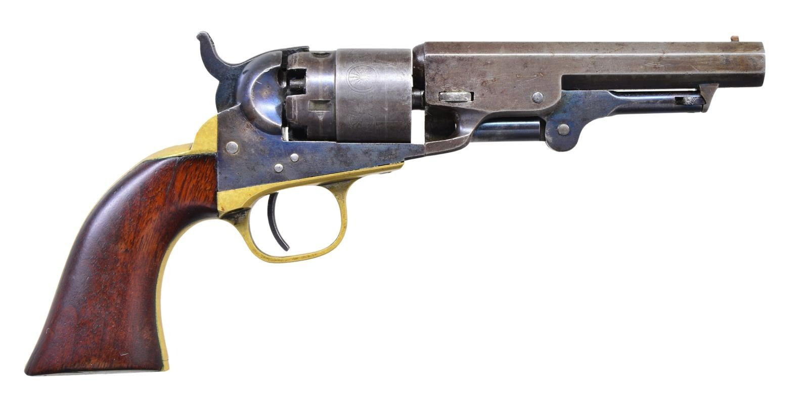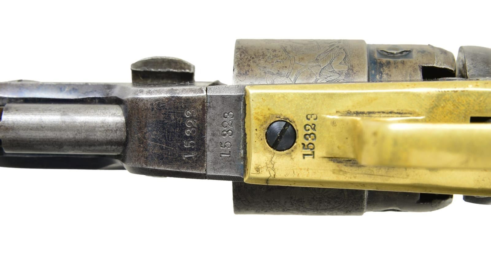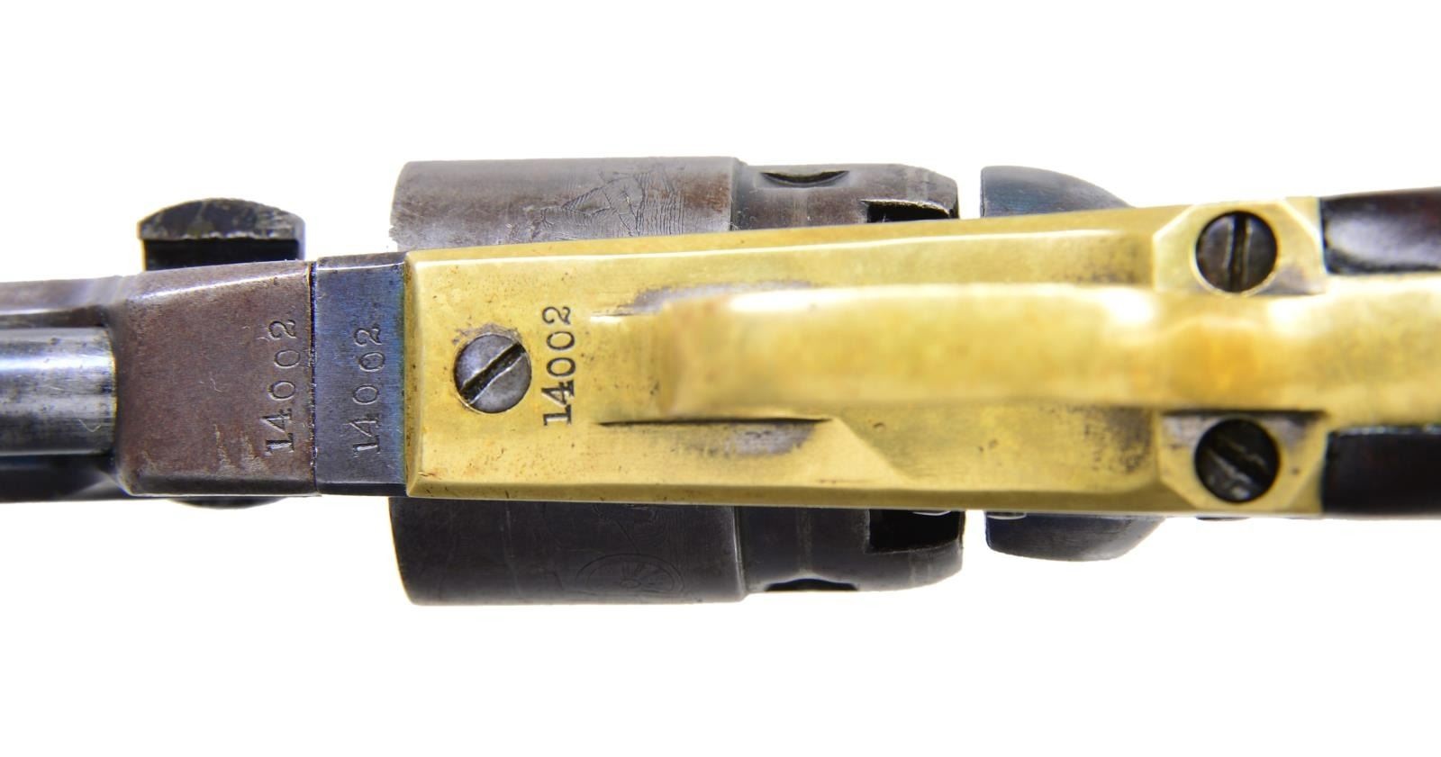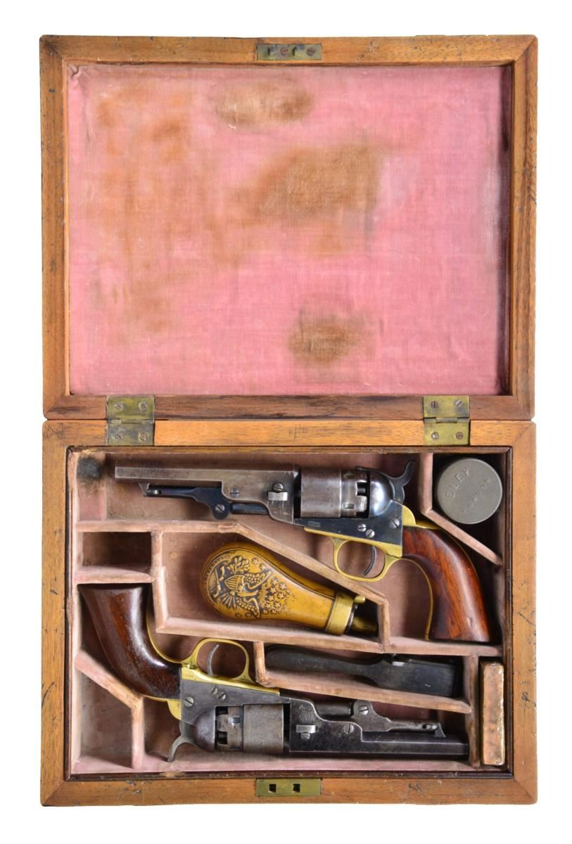 CASE. Both guns: Cals. 36. Bbls. 4 1/2" octagons w/ New York addresses. Round rebated five shot cyls. w/ stagecoach scene roll engravings. Blue & case colored finish w/ silver finished brass backstraps. 1 piece walnut grips. (1) S# 14002. Blade front sight. Bbl., frame, grip straps, cyl. & wedge have matching numbers. Mfg. 1862 during the American Civil War. (2) S# 15323. Cone style brass sight. Bbl., frame, grip straps, cyl. & wedge have matching numbers. Mfg. 1863 during the American Civil War. UNATTACHED ACCESSORIES: added period style casing of fancy walnut w/ brass trim. Faded cloth interior shows wear. Case contains pocket size American eagle flask, 2 cavity mold, cap tin & one wrapped five round package of combustible cartridges. CONDITION: (1) very good. Retains over 30% case colors. Bbl. & cyl. blue fading to gray. Cyl. retains very good scene. Grip straps have traces of silver finish. Refinished grips show handling marks & small dents. Sound mechanics. Lightly pitted bore retains strong rifling. (2) very good. Bbl. retains 30% lightly faded blue showing spots of pitting & having small dents in wedge areas. Cyl. has faded to gray & retains 90% scene. Frame has some lightly visible case colors on left side. Grips have worn & blistering finish showing handling marks. Sound action. Bore retains strong rifling showing spots of light pitting. (01-22877/DS). ANTIQUE. $4,000-6,000.