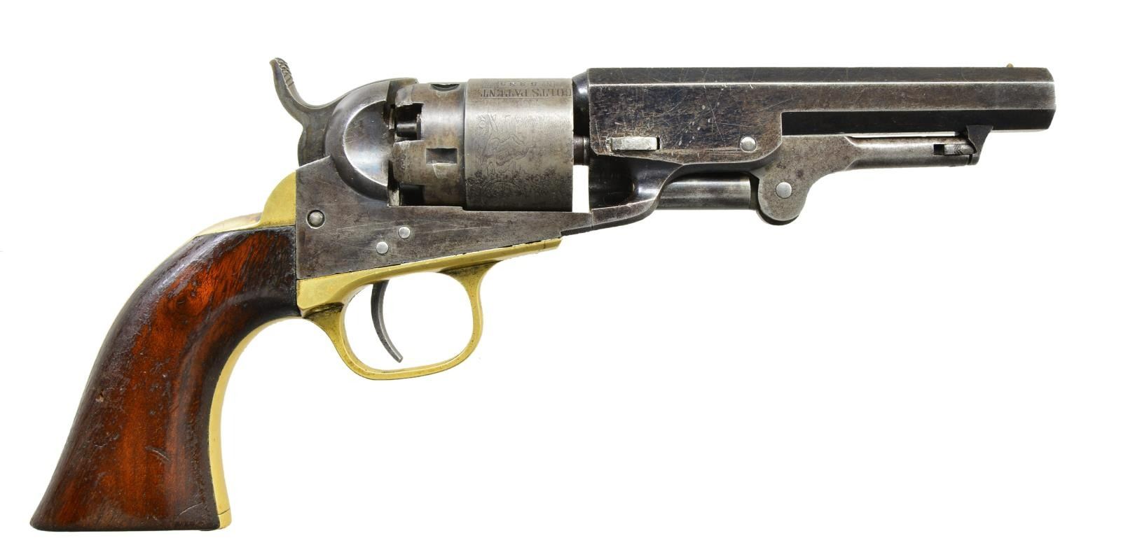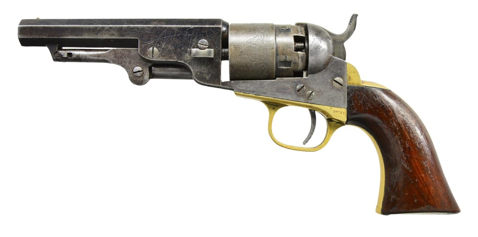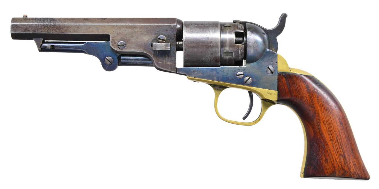 CASE. Both guns: Cals. 36. Bbls. 4 1/2" octagons w/ New York addresses. Round rebated five shot cyls. w/ stagecoach scene roll engravings. Blue & case colored finish w/ silver finished brass backstraps. 1 piece walnut grips. (1) S# 14002. Blade front sight. Bbl., frame, grip straps, cyl. & wedge have matching numbers. Mfg. 1862 during the American Civil War. (2) S# 15323. Cone style brass sight. Bbl., frame, grip straps, cyl. & wedge have matching numbers. Mfg. 1863 during the American Civil War. UNATTACHED ACCESSORIES: added period style casing of fancy walnut w/ brass trim. Faded cloth interior shows wear. Case contains pocket size American eagle flask, 2 cavity mold, cap tin & one wrapped five round package of combustible cartridges. CONDITION: (1) very good. Retains over 30% case colors. Bbl. & cyl. blue fading to gray. Cyl. retains very good scene. Grip straps have traces of silver finish. Refinished grips show handling marks & small dents. Sound mechanics. Lightly pitted bore retains strong rifling. (2) very good. Bbl. retains 30% lightly faded blue showing spots of pitting & having small dents in wedge areas. Cyl. has faded to gray & retains 90% scene. Frame has some lightly visible case colors on left side. Grips have worn & blistering finish showing handling marks. Sound action. Bore retains strong rifling showing spots of light pitting. (01-22877/DS). ANTIQUE. $4,000-6,000.