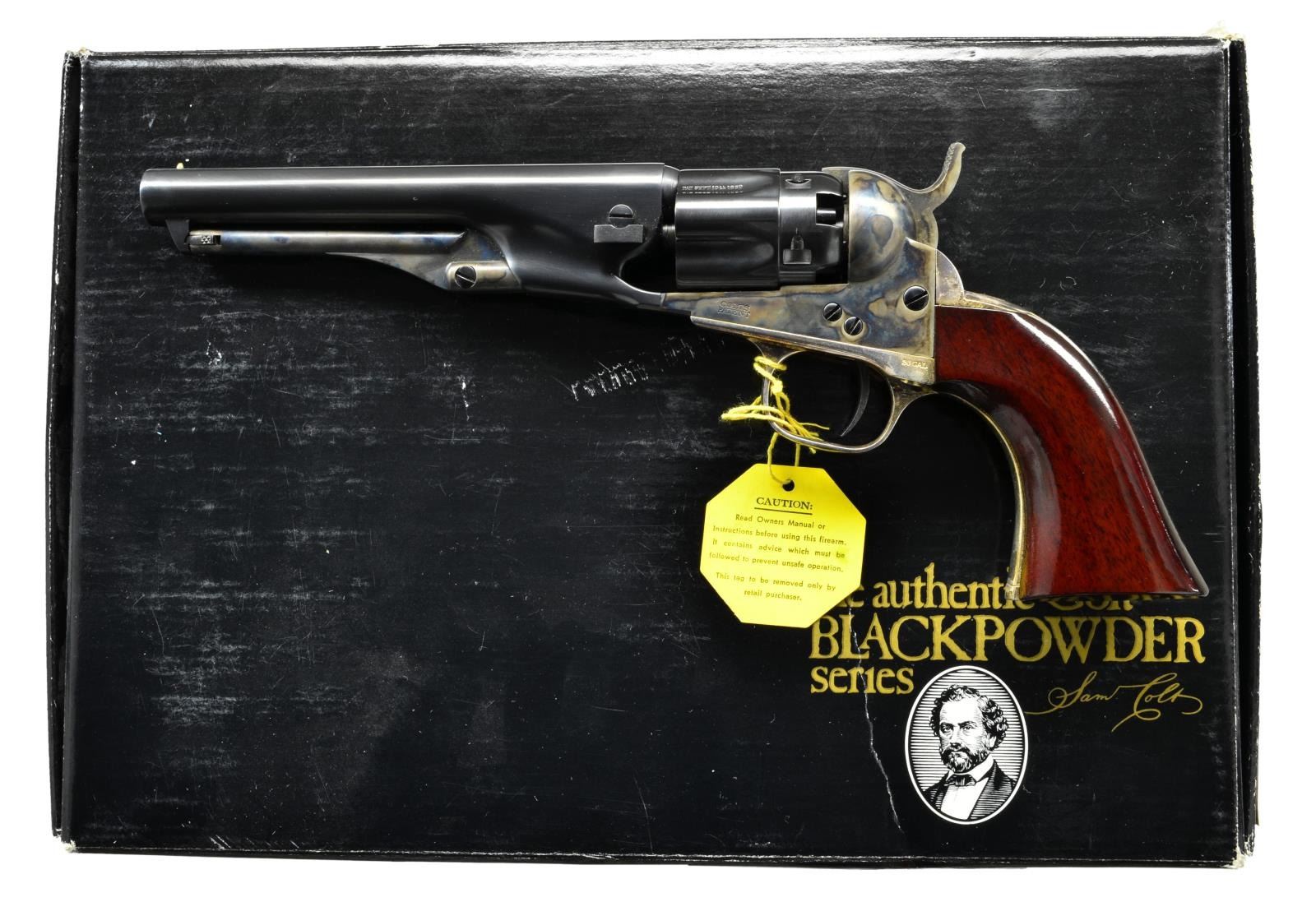 Cal. 36. S# 49972. Bbl. 5 1/2 rnd. 5 Shot cyl w/ September 10th, 1850 patent marking. Case colored frame, hammer & loading lever. Brass back strap and trigger guard. Colt tag present on trigger guard. Walnut grips. UNATTACHED ACCESSORIES: black box end labeled to gun w/ foam insert & paperwork. CONDITION: grips rate excellent but show a loose fit. Metal retains 98% original blue & case colors. Brass parts show light tarnishing. Very good bore. (01-21104/MJC). ANTIQUE. $500-700.