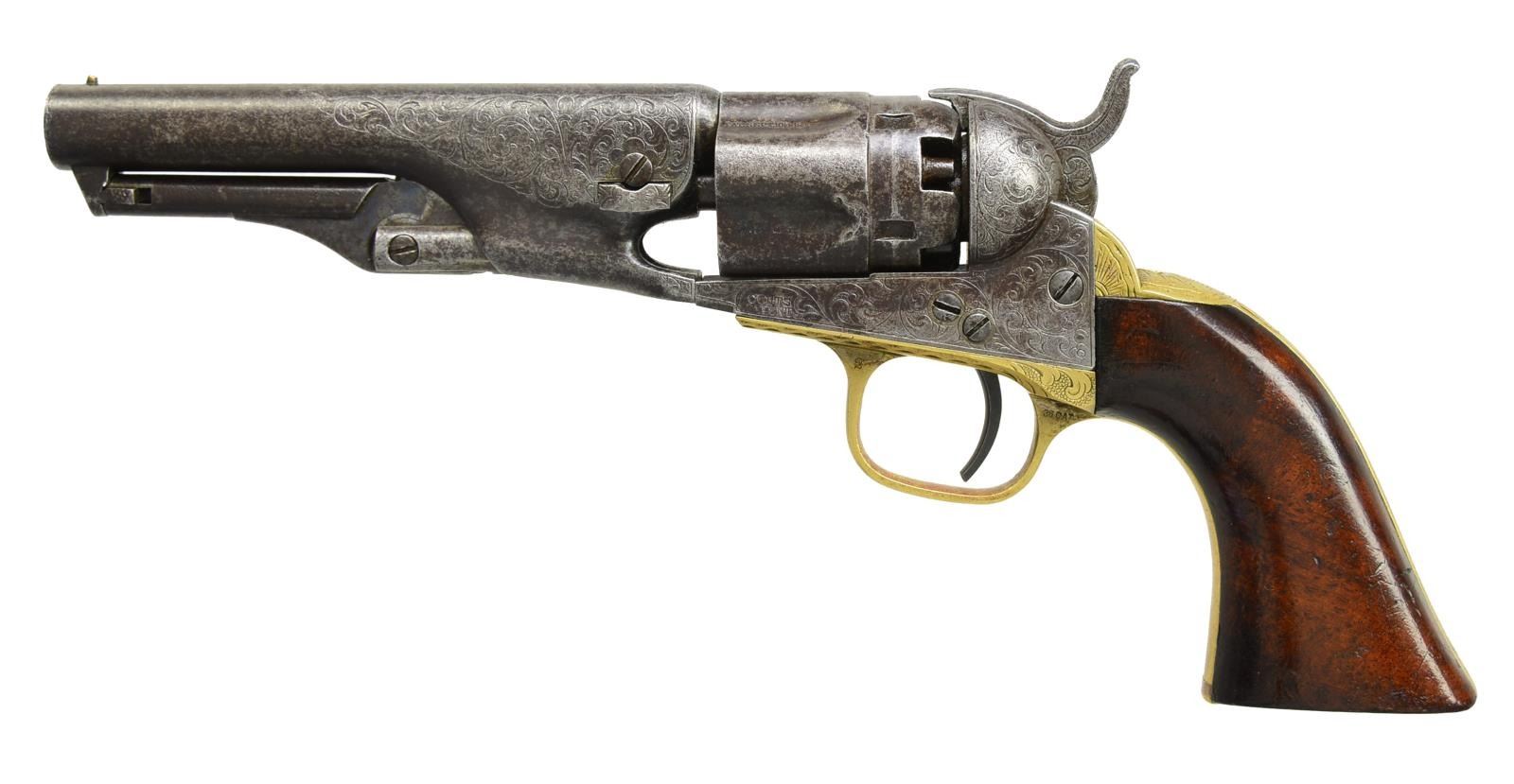 Cal. 36. S# 26948. Bbl. 4 1/2" rnd. w/ bead front sight. 5 Shot fluted cyl. Blue & case colored finish w/ brass grip straps. Bbl., frame & grip straps have factory vine type foliate scroll engraving w/ pearled backgrounds & straight line borders. Frame, trigger guard & back strap are marked "E" below serial numbers confirming the factory engraving. 1 Piece walnut grip. Mfg. 1864. CONDITION: bbl. & action are fading to gray showing sm. dents & scattered spots of corrosion & very light pitting. Loading lever & protected areas of frame show traces of case colored finish. Grip straps have faint traces of silver finish w/ brass showing a light cleaning. Grips have worn finish showing numerous sm. dents & handling marks. Sound action. Bore retains intact rifling. (01-18094/DS). ANTIQUE. $2,500-3,500.