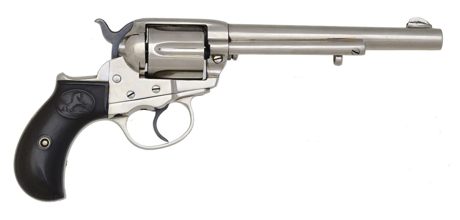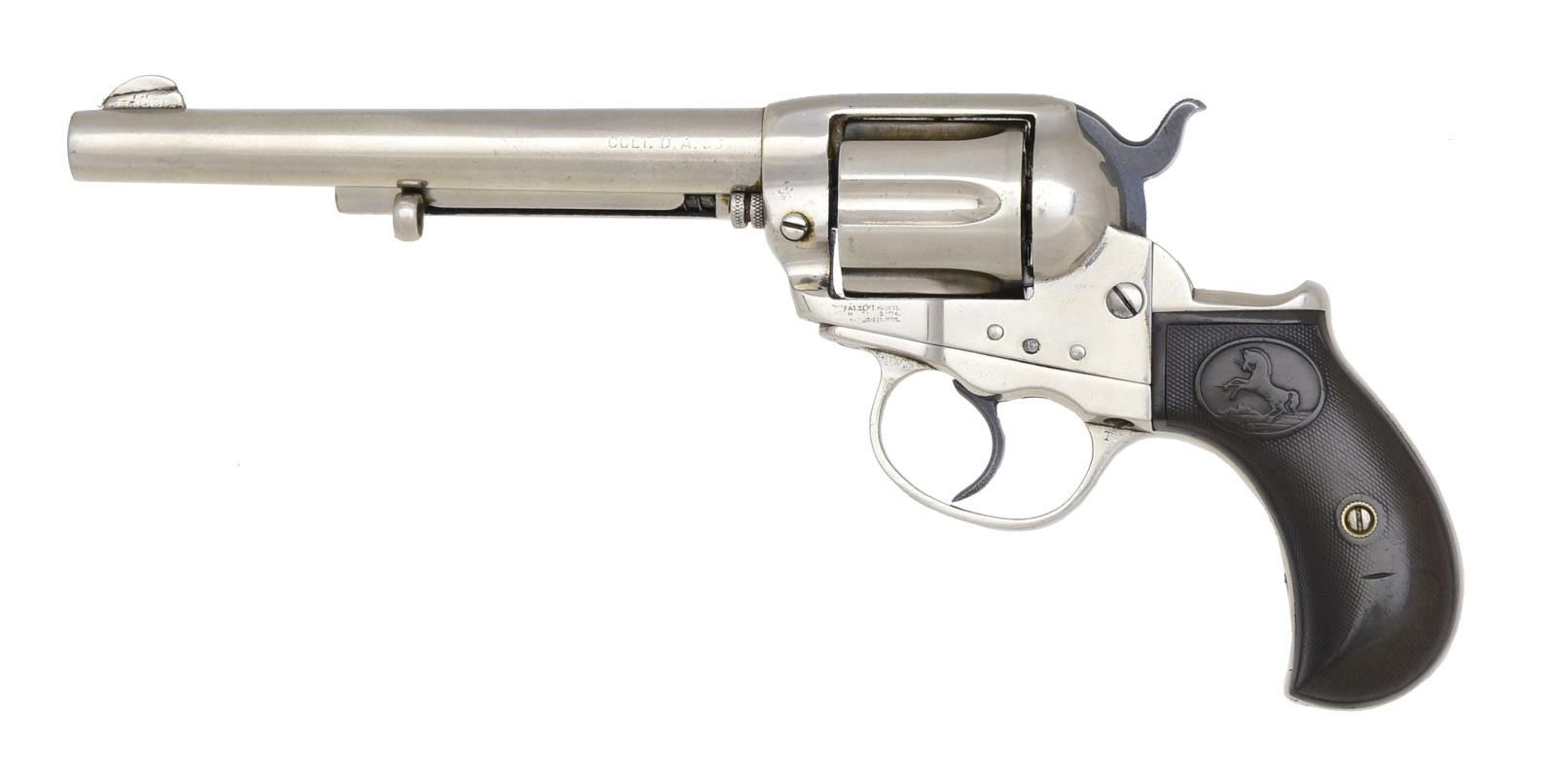 HISTORY. Cal. 38 Colt. S# 161352. Bbl. 6" w/ ejector. Blade front sight has replacement thinner blade. 6 Shot fluted cyl. Renickeled finish w/ blued hammer & trigger. 2 Piece checkered hard rubber grips. 1906 Mfg. UNATTACHED ACCESSORIES: letter from Joe Hunt Sheriff, Tom Green County, San Angelo, TX. Letter gives history of the Colt Lightning & states the following information" To Whom It May Concern: / Subject: Colt pistol, Model 1877 DA Lightning / Caliber 38 / Serial number 161352 / This Colt pistol was property of the Tom Green County Sheriff's Department, which was established in 1875". Joe Hunt was a legendary Texas Ranger & after retirement, the Tom Green County Sheriff. Includes copy of the "Texas Ranger Hall of Fame E Book" that contains Joe Hunt's obituary, "Texas Iron, Guns of the Texas Rangers" by Robert D. Moser, & "Texas Ranger, Campfire Tales" by Joe B. Hunt. CONDITION: 98% renickeled finish, some markings are weak. Grips have worn checkering showing handling marks. Action will not function in SA mode. Pitted bore retaining largely intact rifling. PROVENANCE: Collection of Alan Bradley Shepherd. (20-4072/DS). CURIO. $1,000-1,500.