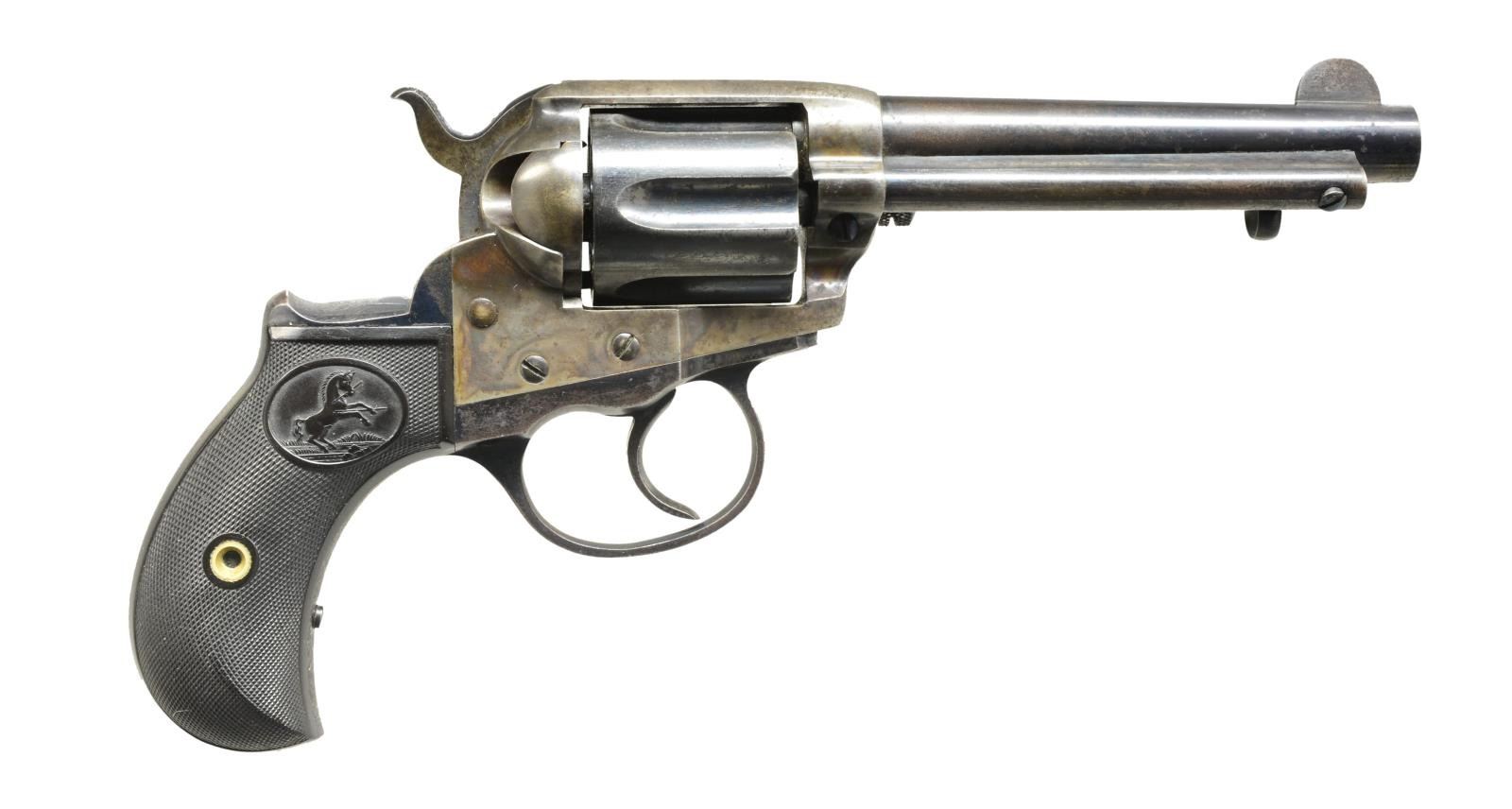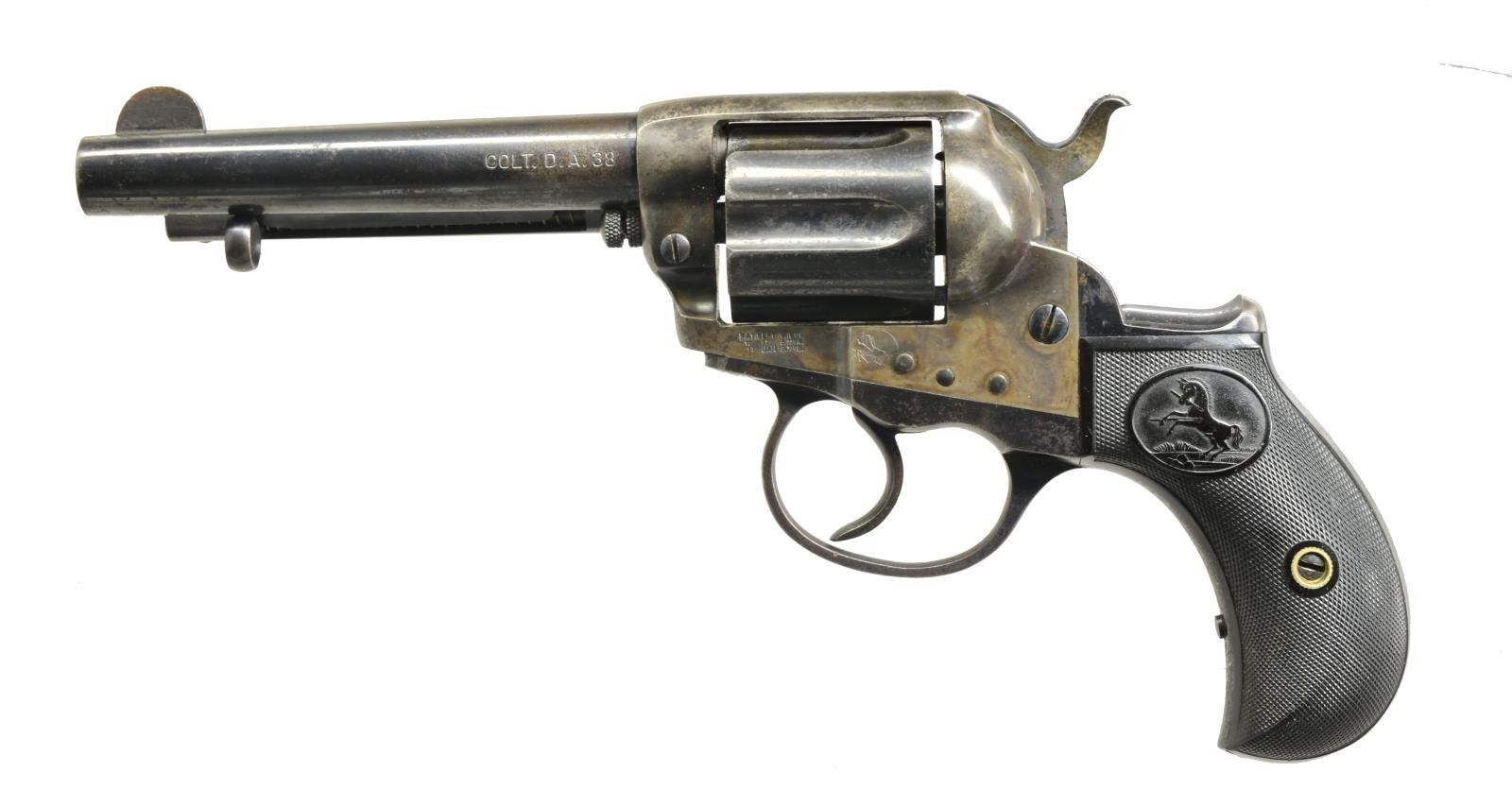 Cal. 38 Colt. S# 142126. Bbl. 4 1/2" w/ semicircular sight. 6 Shot fluted cyl. Blue finish & case colored frame. 2 Piece checkered hard rubber Rampant Colt bird's head grips. 1903 Mfg. CONDITION: bbl., cyl. & grip straps retain 60% blue showing scattered surface corrosion. Frame retains 30% light faded case colors blending w/ spots of corrosion. Grips show light wear. Sound mechanics. Bore retains strong rifling showing spots of pitting. PROVENANCE: Collection of Alan Bradley Shepherd. (20-4078/DS). CURIO. $700-1,000.