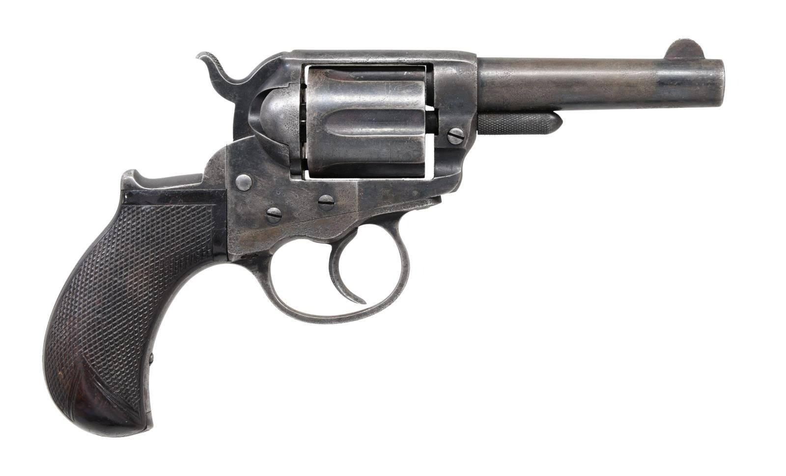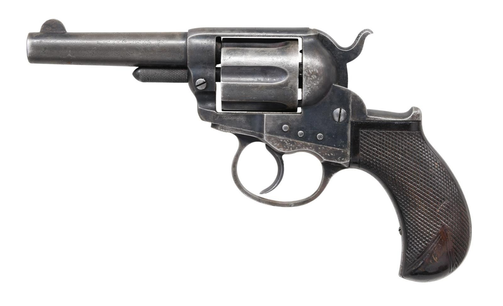 Cal. 38 Colt. S# 27401. Bbl. 3 1/2" with Hartford & Pall Mall London markings. Six-shot, fluted cyl. Blue finish with 1-piece checkered walnut, round butt grips. CONDITION: 60% dull, fading blue, showing scattered light pitting. Grips show light wear and handling marks. The trigger return spring sometimes fails to function. A lightly pitted bore has worn rifling. (01-24355/DS). ANTIQUE. $600-800.