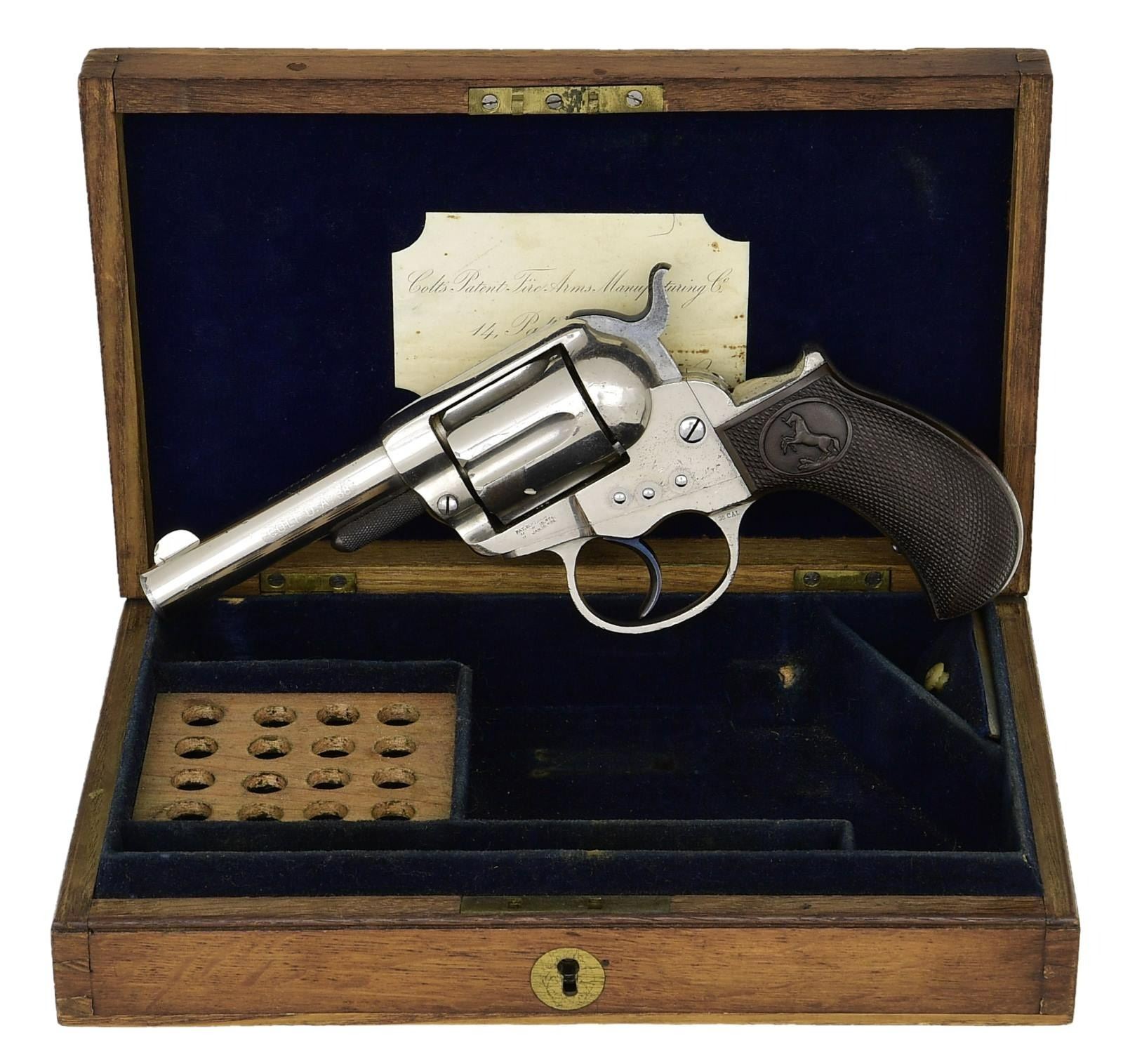 Cal. 38 Colt. S#.3083. Bbl. 3 1/2" with Hartford address, and etched panel caliber marking. Blade sight. 6 shot fluted cyl. Nickel finish with fire blued trigger & hammer, hammer has polished sides. 1 piece checkerd hard rubber round butt rampant colt grips. 1878 mfg. UNATTACHED ACCESORIES: English trade casing. Original paper label on inside lid is marked "Colts. Patent. FireArms, Manufacturing Co. / 14, Pall. Mall. S.W. / London." Blue velour fitted interior with 16 round wood cartridge black. Case contains a wire cleaning rod. CONDITION: Fine retaining over 80% nickel showing scattered flaking & marks. Etched panel caliber marking is clear & well defined. Hammer & trigger have strong fire blue. Grips show light wear. Action sound & tight. Very good rifling with a few spots of light pitting. PROVENANCE: From the Lifelong Collection of Glen E. Mattox. (01-22429/DS). ANTIQUE. $2000-3000.