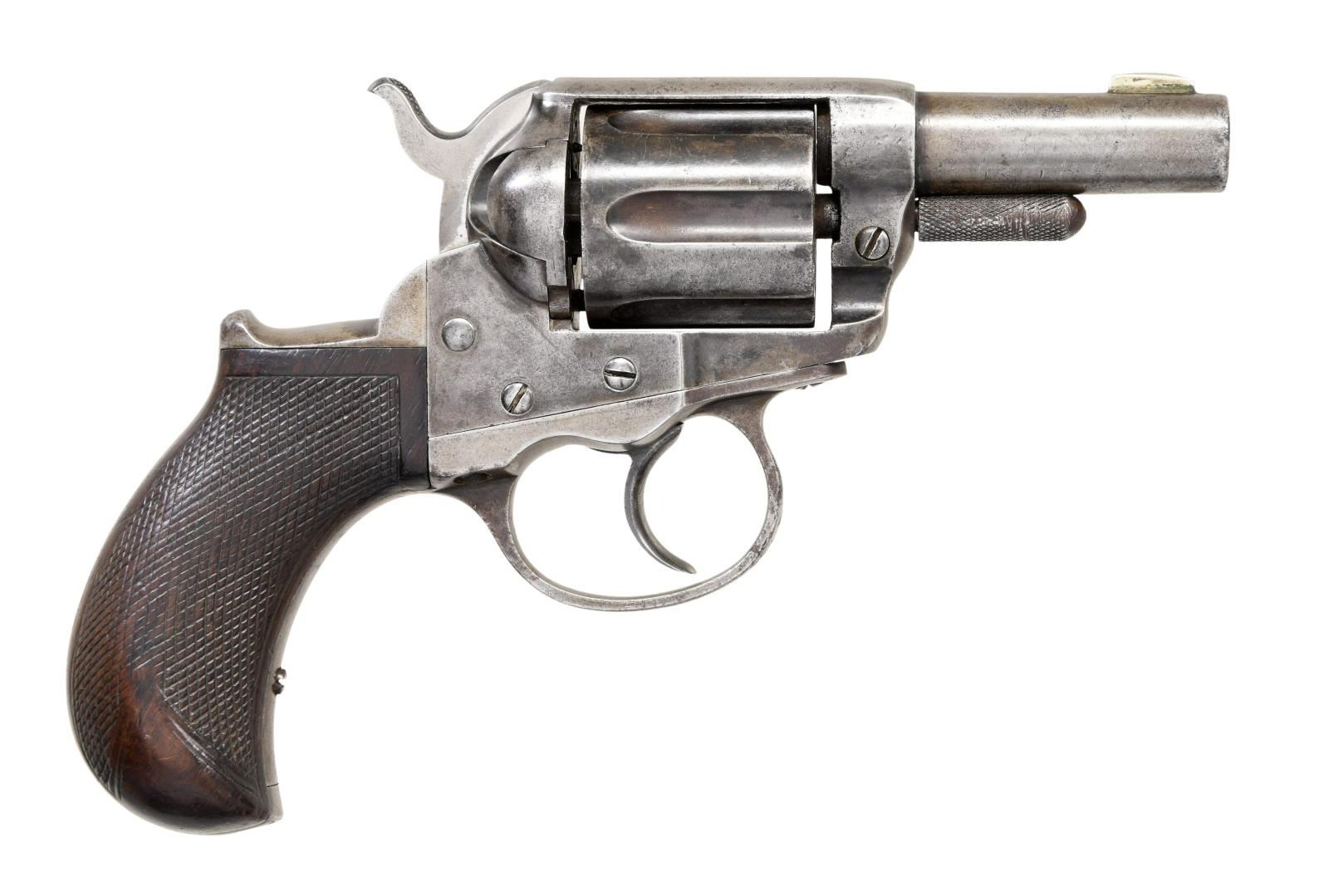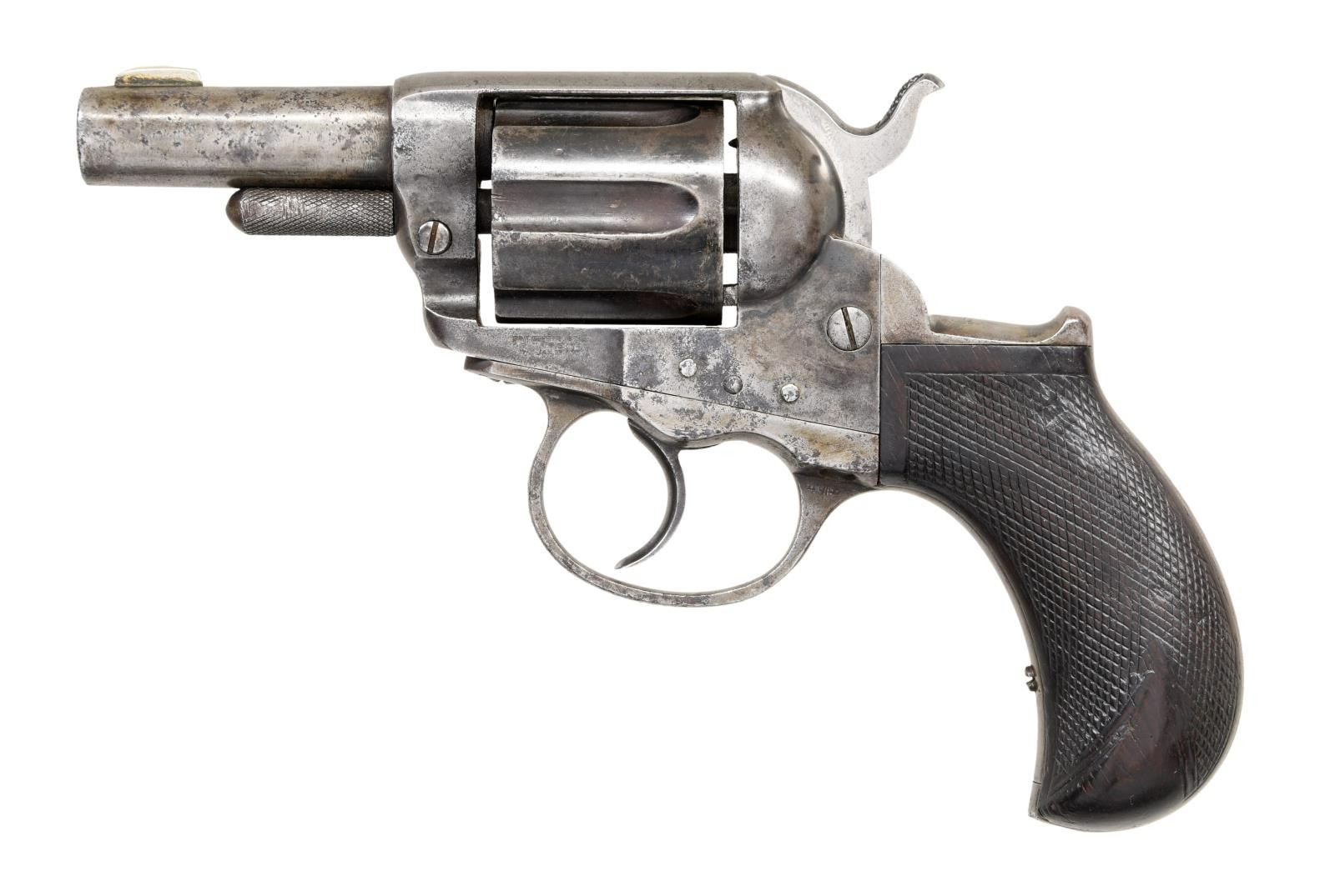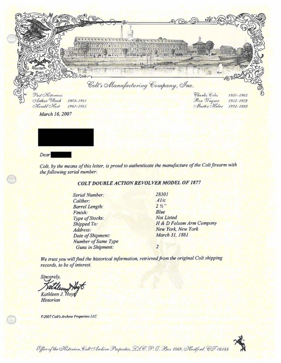 ACTION REVOLVER WITH FACTORY LETTER. Cal. 41 LC. S# 28301. Bbl. 2 1/2". 1877 Thunderer Storekeepers Model double action revolver mfg. by Colt in 1881. Top of bbl. is marked with Colt's 2-line address having patent information marked on the left side of the frame. Frame is mounted w/ a 1-piece checkered wood grip. German silver blade front sight having frame notched rear sight. Matching numbers are present on the frame, trigger guard, and butt. Cyl. appears to match w/portions of the S# being partially illegible. UNATTACHED ACCESSORIES: factory letter indicates that this revolver was shipped w/ a 2 1/2" bbl., blue finish, "Not Listed" stocks plus was sent in a shipment of 2 revolvers to H & D Folsom Arm Company in New York, NY on March 31st, 1881. CONDITION: metal components exhibit a mottled gray patina, plus areas of pitting present overall. Poor pitted bore, exhibits strong rifling throughout. Grip shows smoothing plus scattered marks from handling & storage, but otherwise remains sturdy & serviceable. (01-25277/MLW). ANTIQUE. $500-800.