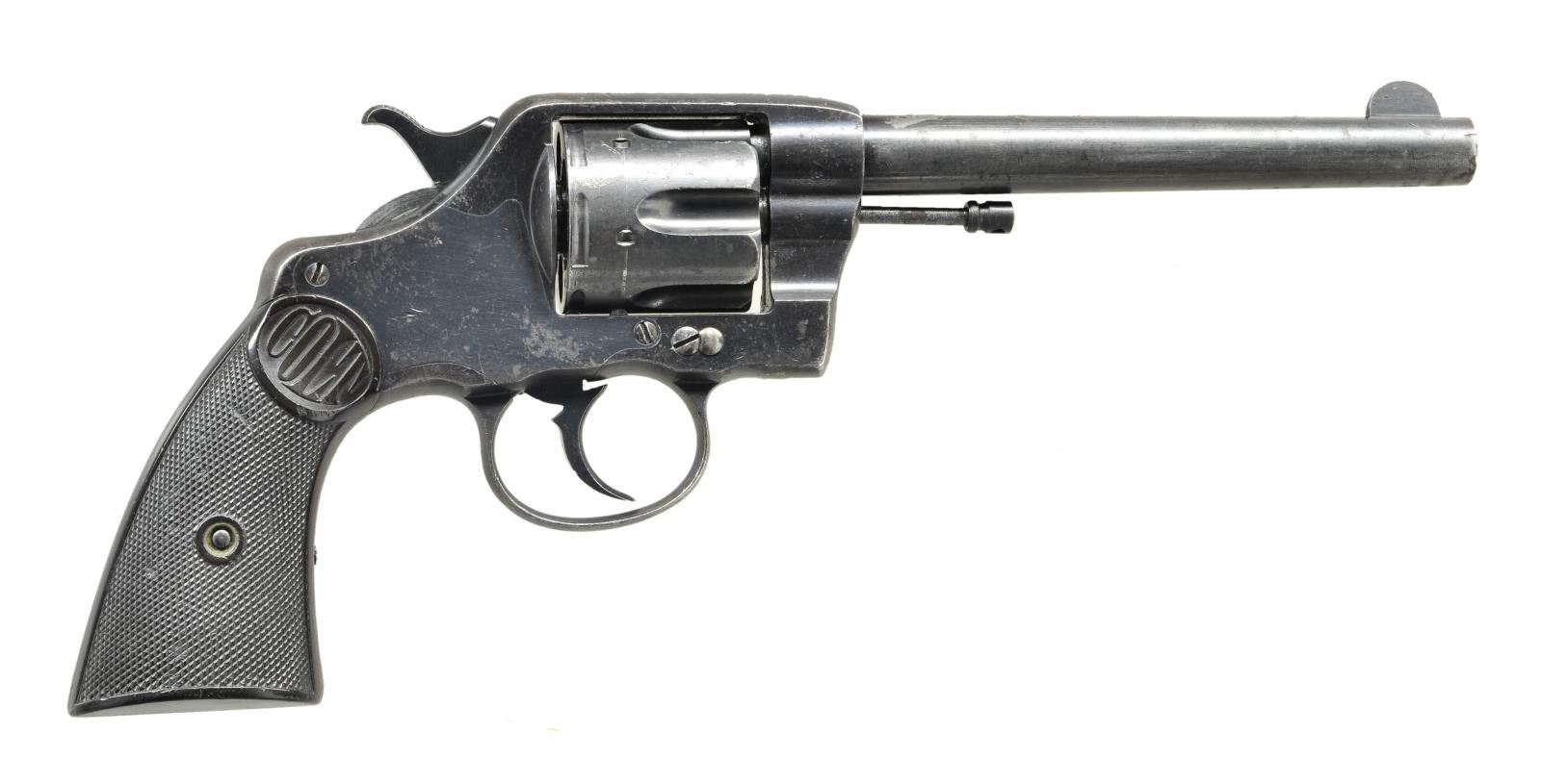 Cal. 38 Colt. S# 16034. Bbl. 6" round with blade sight. 2 Line Hartford address ending with November 6, 1888 patent date. 6 Shot fluted cylinder revolves counter clockwise. Blue finish. Butt is marked "U.S.N. / (Navy anchor) / .38 D..A. / Navy sub inspector trident marking / No / 5468" followed by partially obscured 3 letter inspectors mark starting with "NC" and serial number 16034. Cylinder latch and inside of frame and crane have assembly number "34". 2 Piece checkered hard rubber grips with oval Colt motif. Mfg. 1895. CONDITION: 70% dull blue showing edge and carry wear with spots of finish loss and corrosion. Grips show moderate wear with small crack at butt of left panel. Action is in time. Bore is bright with sound rifling. (01-21699/DS). ANTIQUE. $800-1,200.
