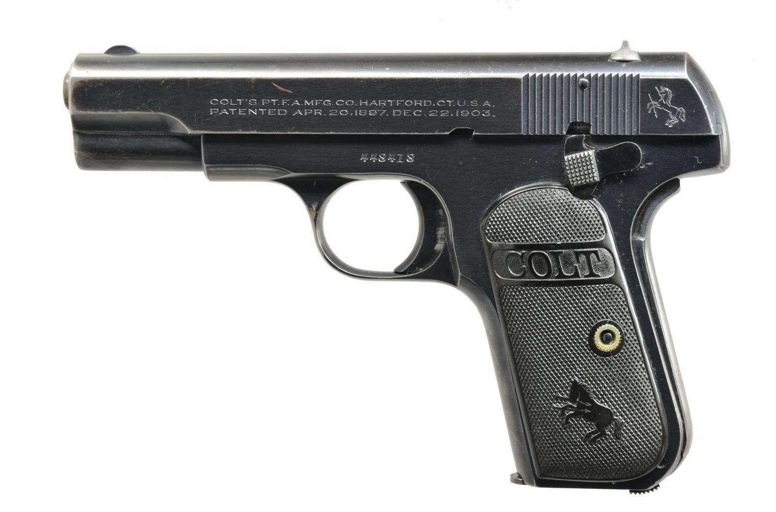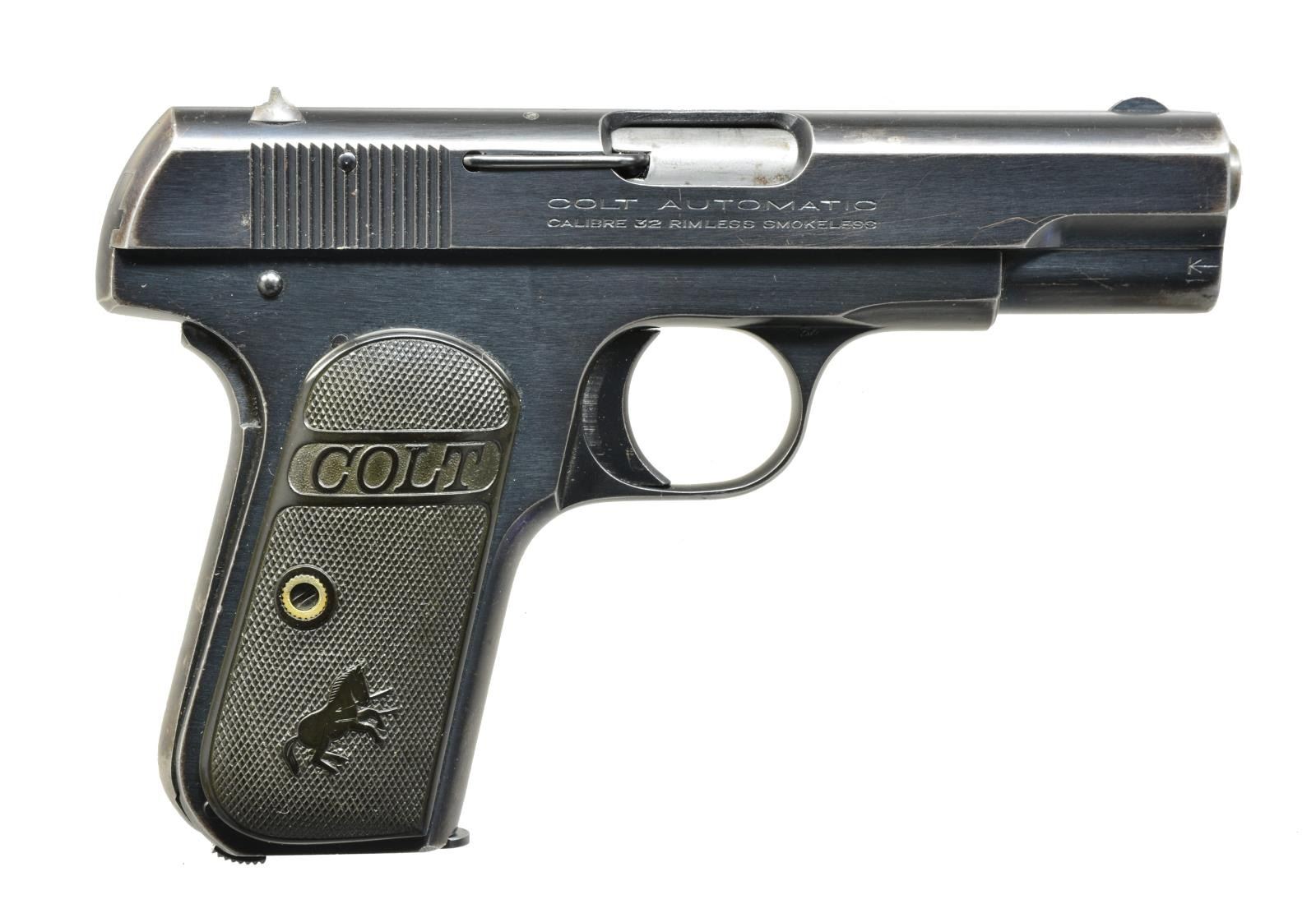 Cal. 32 ACP. S# 448418. Bbl. 3 3/4". Semicircular front sight w/ U notch fixed rear sight. Blue finish. 2 Piece checkered hard rubber Rampant Colt grips. 1925 Mfg. MAGS: 1 two tone 8 rd. CONDITION: over 80% blue showing edge & carry wear. Grips show light wear. Bore retains strong rifling. (20-3309/DS). CURIO. $500-800.