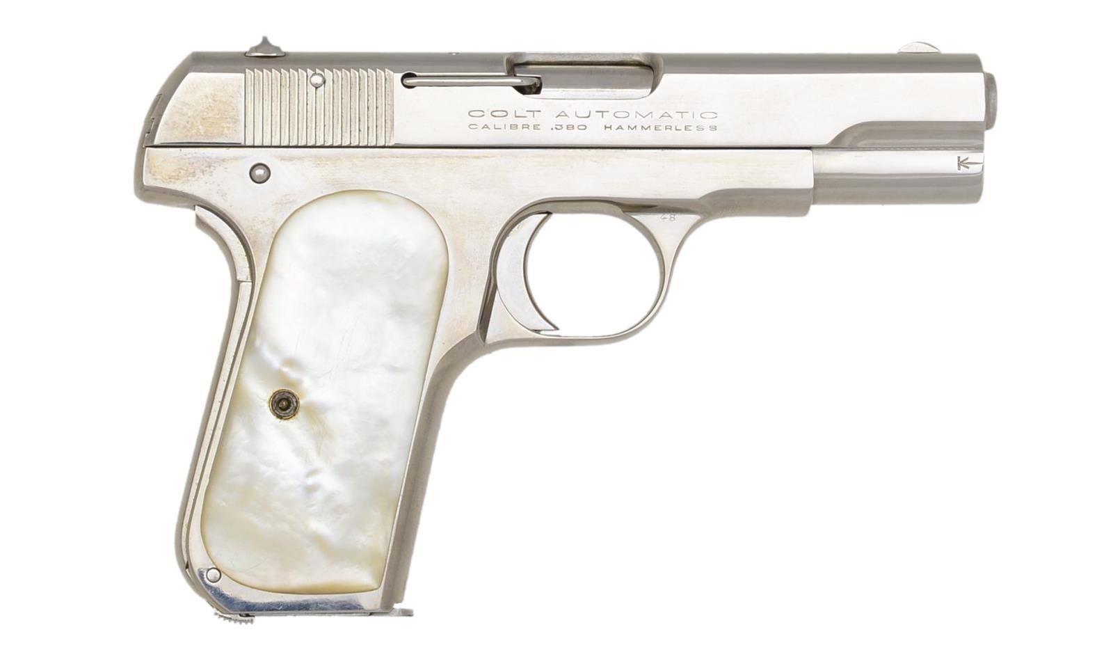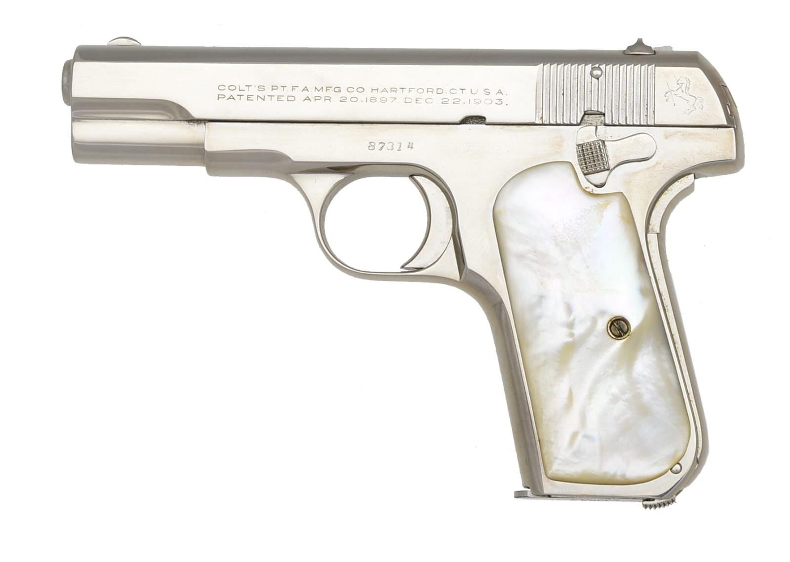 Cal. 380 ACP. S# 87314. Bbl. 3 3/4". Semicircular front sight w/ U notch rear sight. Full renickeled finish. 2 Piece pearl grips. 1928 Mfg. MAGS: 1 detachable 7 rd. UNATTACHED ACCESSORIES: glass fronted wooden display box w/ black velour interior. CONDITION: 99% renickeled finish showing light marks. Very good grips. Bore retains sound rifling. PROVENANCE: Collection of Alan Bradley Shepherd. (20-4049/DS). CURIO. $600-900.