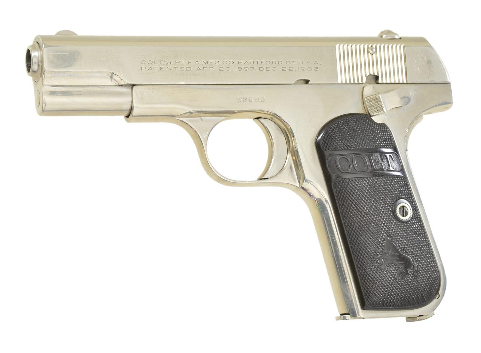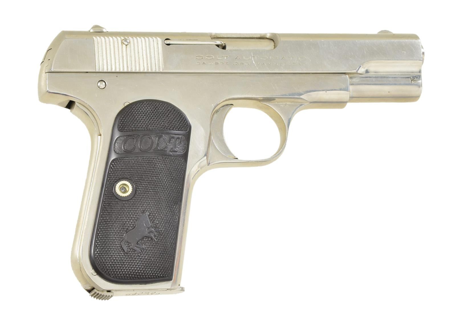 Cal. 380 ACP. S #82083. Bbl. 3 3/4". Semi circular front sight. Fixed U-notch rear sight. Nickel finish. Checkered hard rubber grips w/ Rampant Colt. 1913 mfg. date. Mags. 1-7 rd. CONDITION: grips show light wear. Metal retains 90-95% original nickel w/ scattered light scratches. Very good plus bore. (22-3583/MJC). CURIO. $500-700.