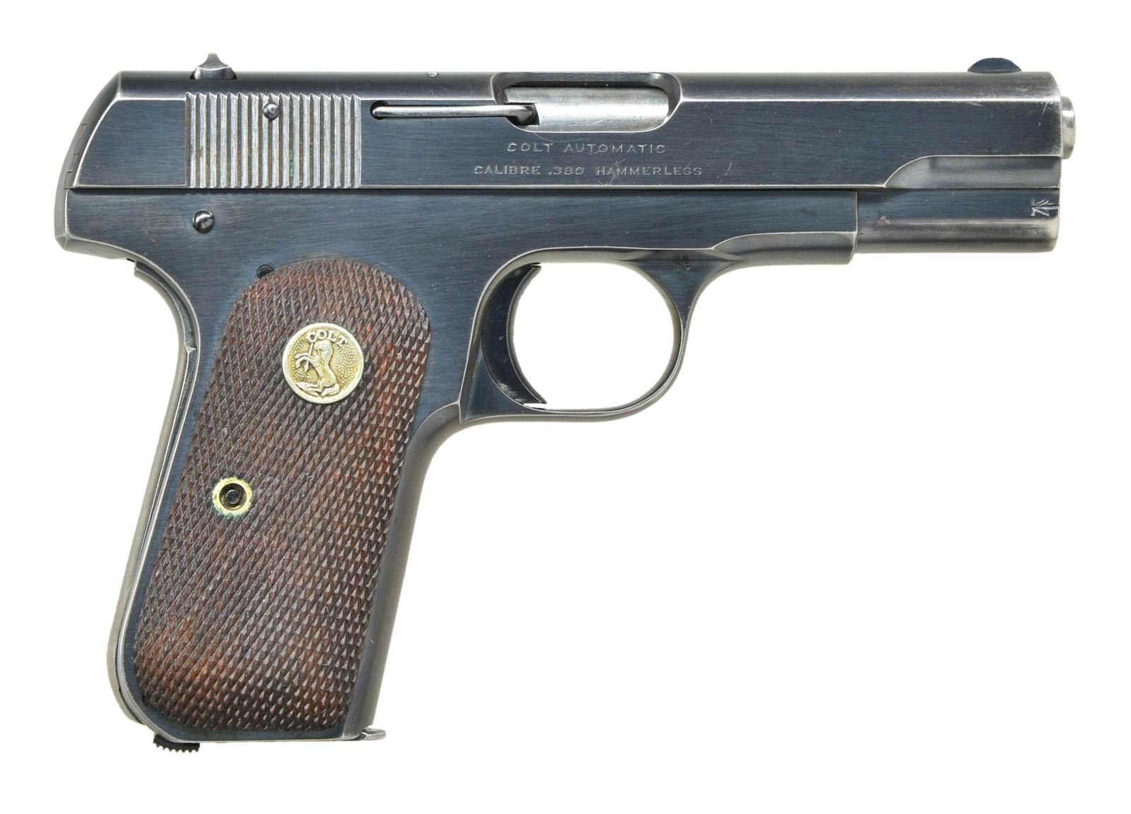 Cal. 380 ACP. S #49714. Bbl. 3 3/4". Semi circular front sight. U-notch rear sight. Blue finish. Checkered walnut grips w/ Rampant Colt medallions. 1921 mfg. date. MAGS: 1-7 rd. marked "CAL 380 & "COLT". CONDTION: grips show light handling wear. Metal retains 90% original blue w/ a couple patches of light pitting on left side of slide, some thinning on both grip straps, light high edge wear & scattered light handling marks. Bore shows scattered frosting & a couple light pits. (22-3069/MJC). CURIO. $500-1000.