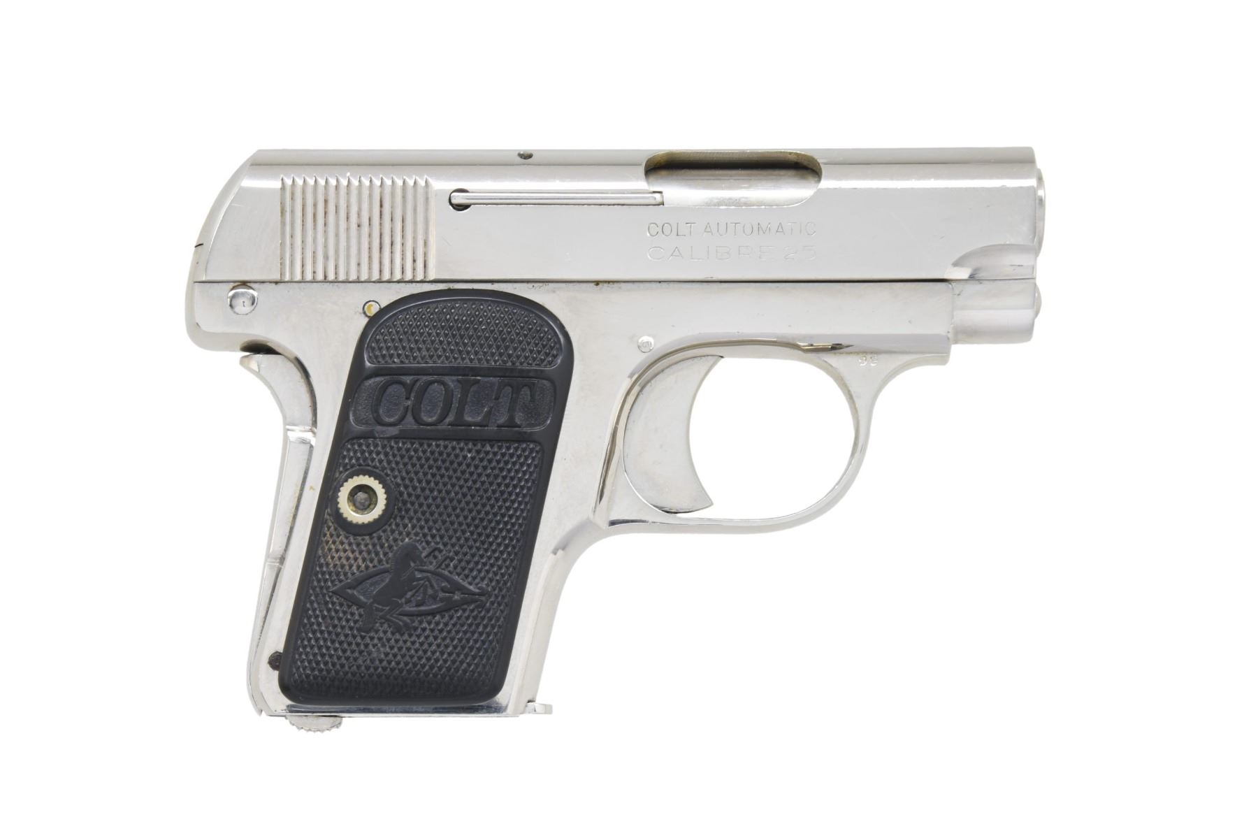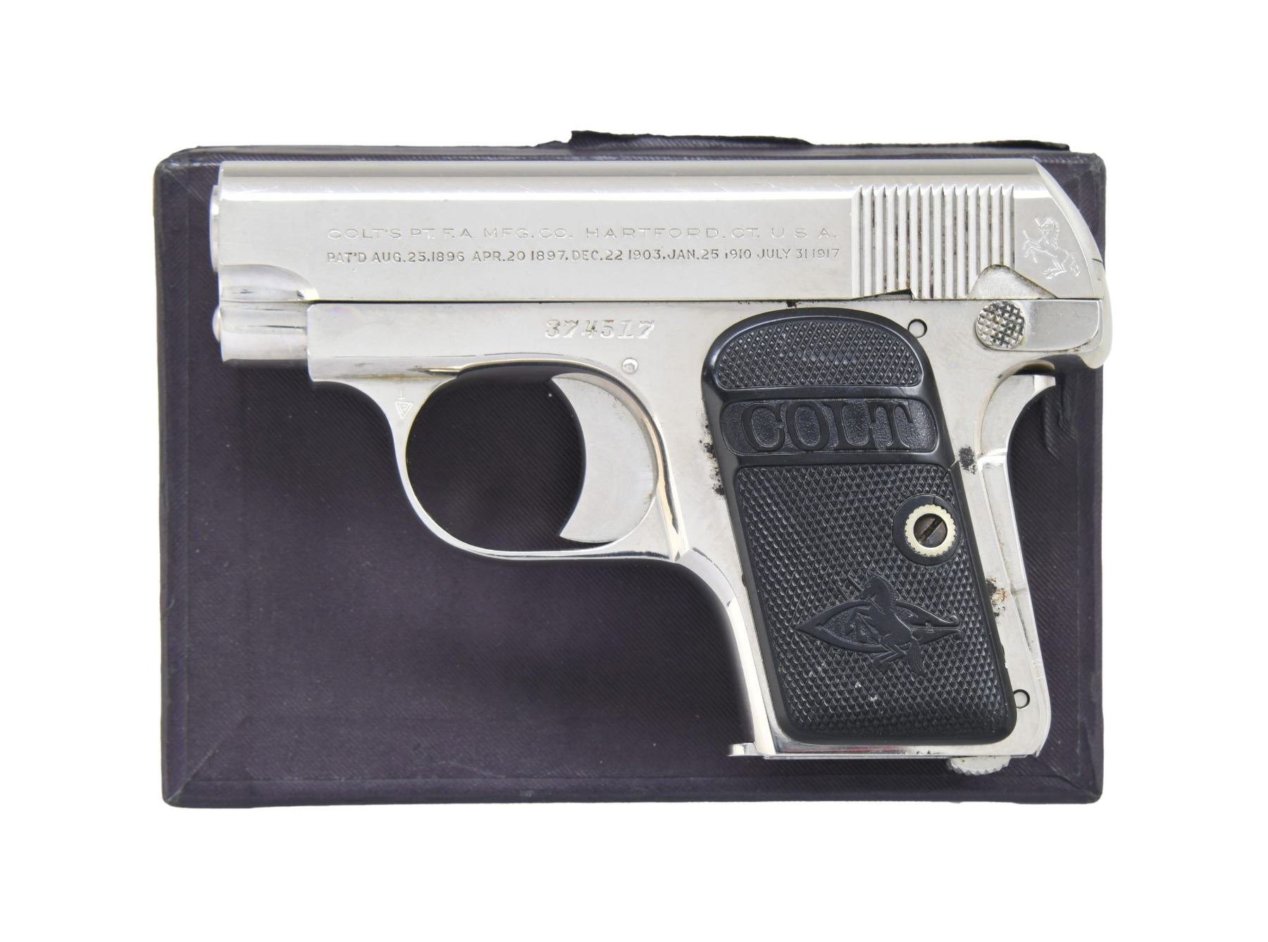 Cal. 25 ACP. S#. 374517. Bbl. 2". Full nickel finish. Checkered hard rubber grips. MAGS. 1 detachable 6 shot. UNATTACHED ACC. properly numbered 1 piece box containing instructions. CONDITION: original nickel finish shows scattered scratches, marks & spots of corrosion around grips. (25-638/DS). CURIO. $800-1200.