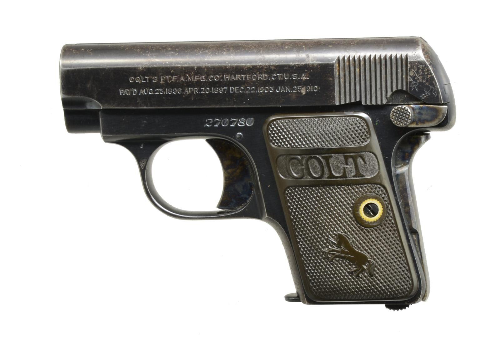 Cal. 25 ACP. S# 270780. Bbl. 2". Blue finish w/ case colored trigger & safeties. 2 Piece checkered hard rubber Rampant Colt grips. 1920 Mfg. MAGS: 1 detachable 6 rd. CONDITION: over 80% lightly faded metal finish showing edge wear & spots of freckling. Grips show light wear. Right panel has sm. crack between attachment screw & right edge. Bore has dark frosted appearance. PROVENANCE: Collection of Alan Bradley Shepherd. (20-4047/DS). CURIO. $400-600.