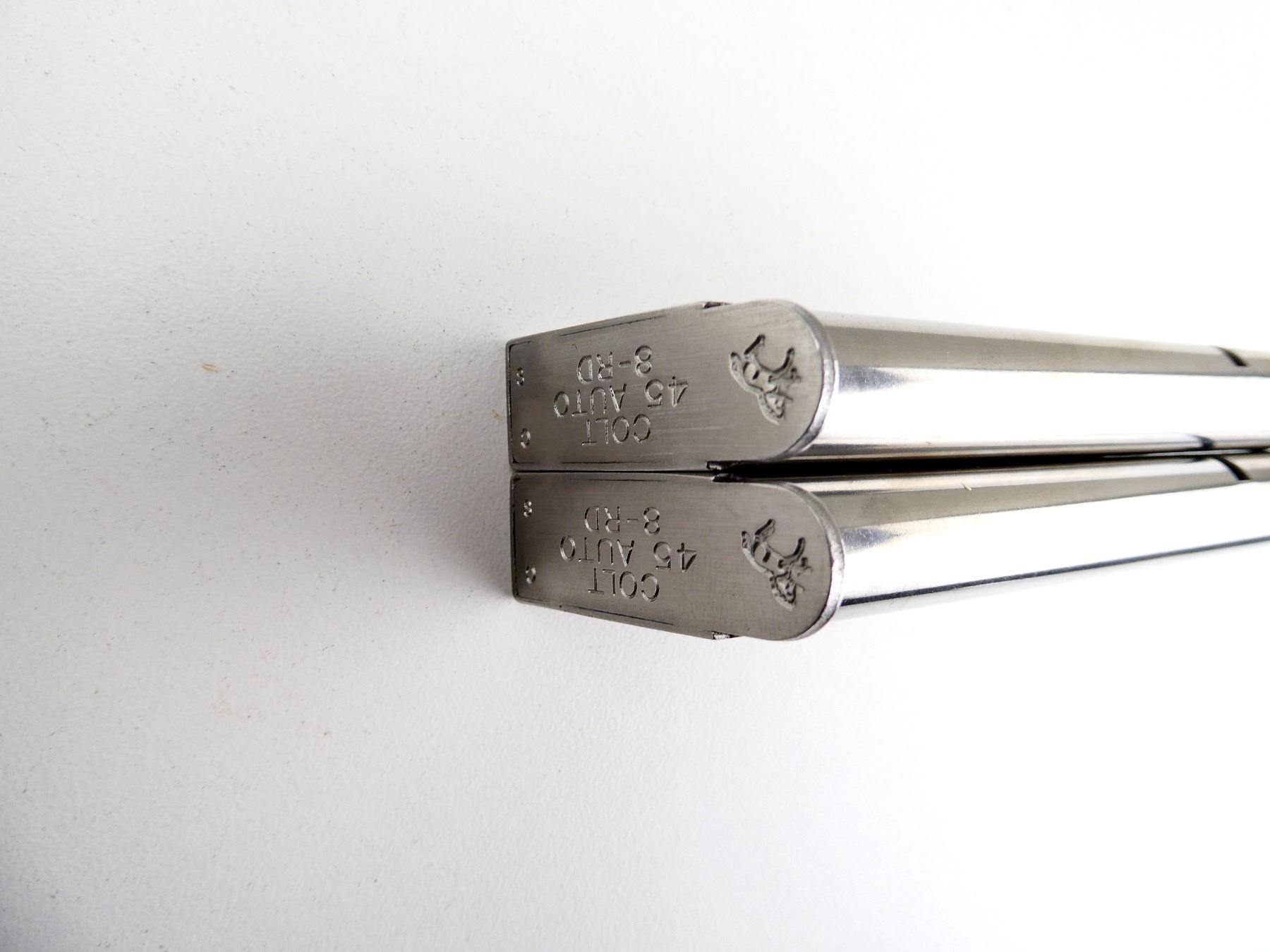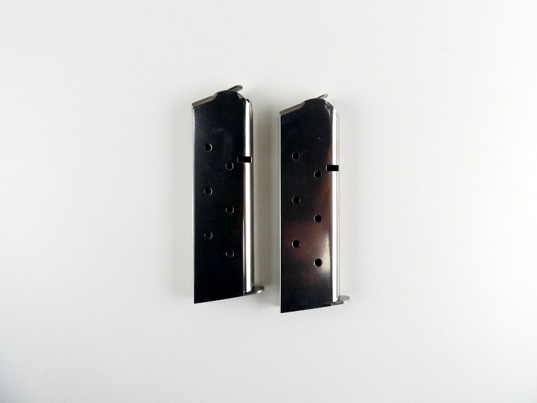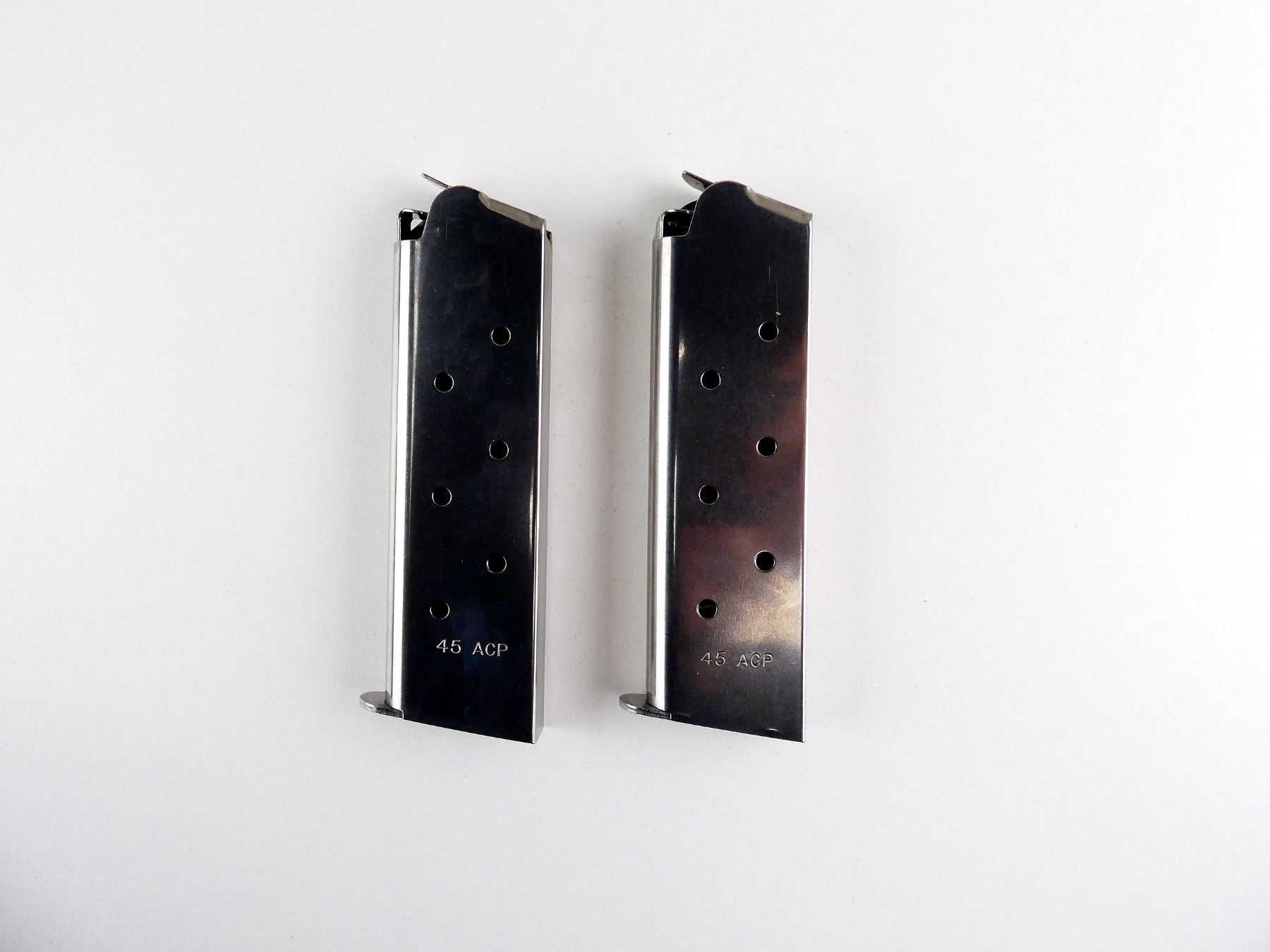 LOT INCLUDES; (2) 1911 .45 ACP MAGS, 8 RNDS, STAINLESS STEEL CONSTRUCTION, BASE MARKED: "COLT, 45 AUTO, 8-RND". SEE PHOTOS. PAL REQUIRED.