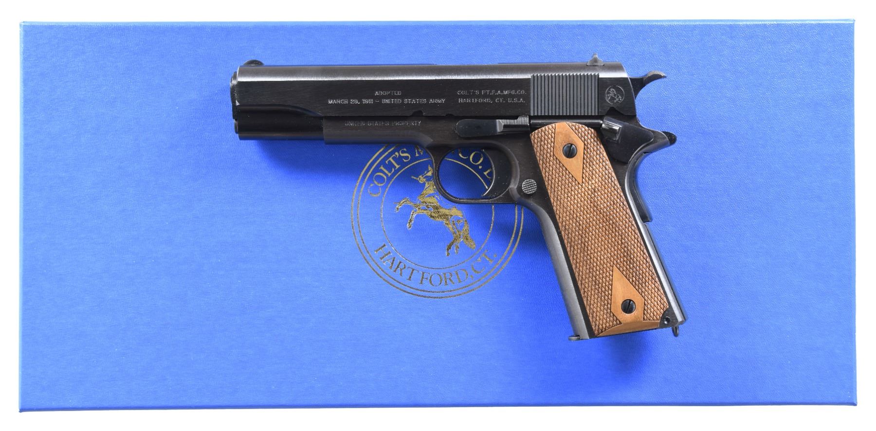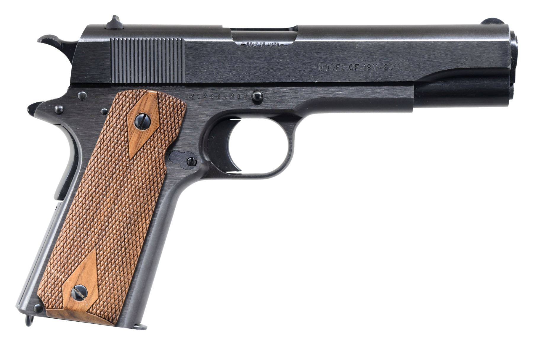PISTOL. Cal. 45 ACP. S# 59441911. Bbl. 5". GI style sights. 100th Anniversary commemorative 1911 pistol. Right side of slide marked "MODEL OF 1911-2011". Left side of slide marked "ADOPTED/MARCH 29, 1911-UNITED STATES ARMY". Left side of frame marked "UNITED STATES PROPERTY". Blued finish. Checkered walnut grips. MAGS: 2-7 rd. UNATTACHED ACCESSORIES: matching numbered shipping sleeve with box, two manuals, paperwork, trigger lock & tool. CONDITION: all aspects near new in the box with hang tags present on trigger guard. (24-6626/MJC). MODERN. $800-1200.