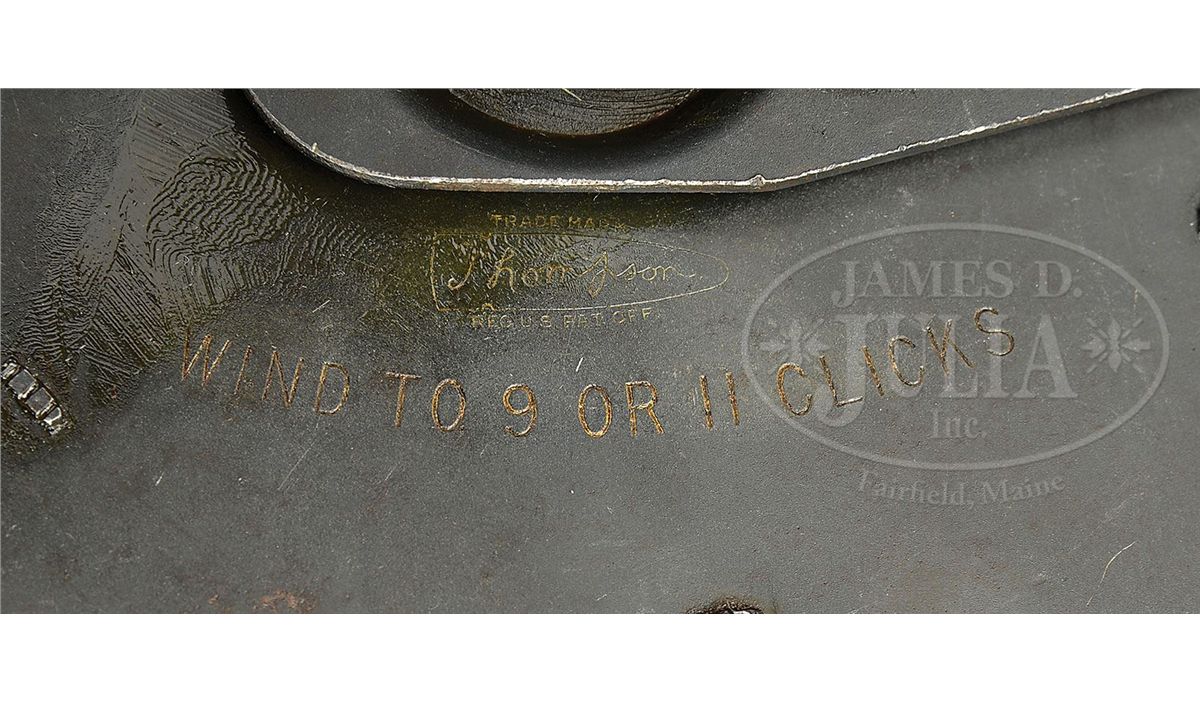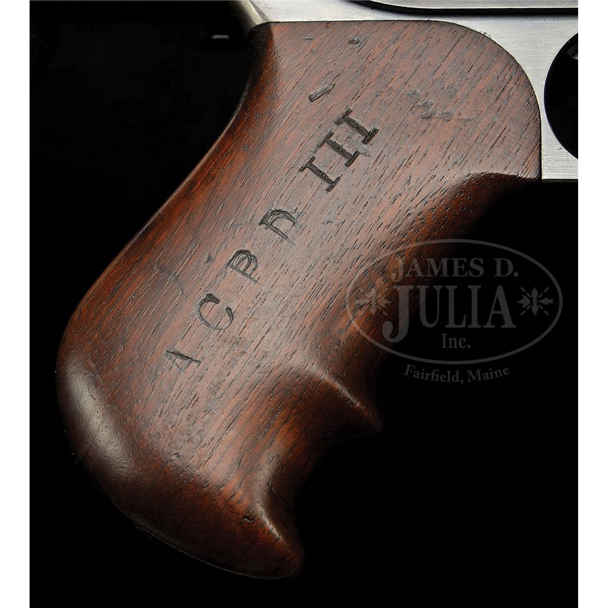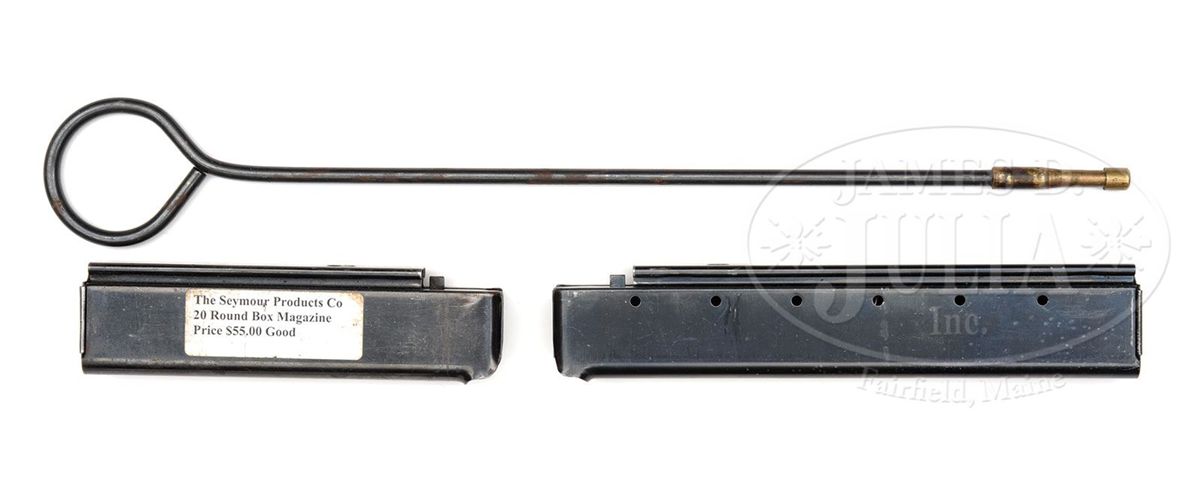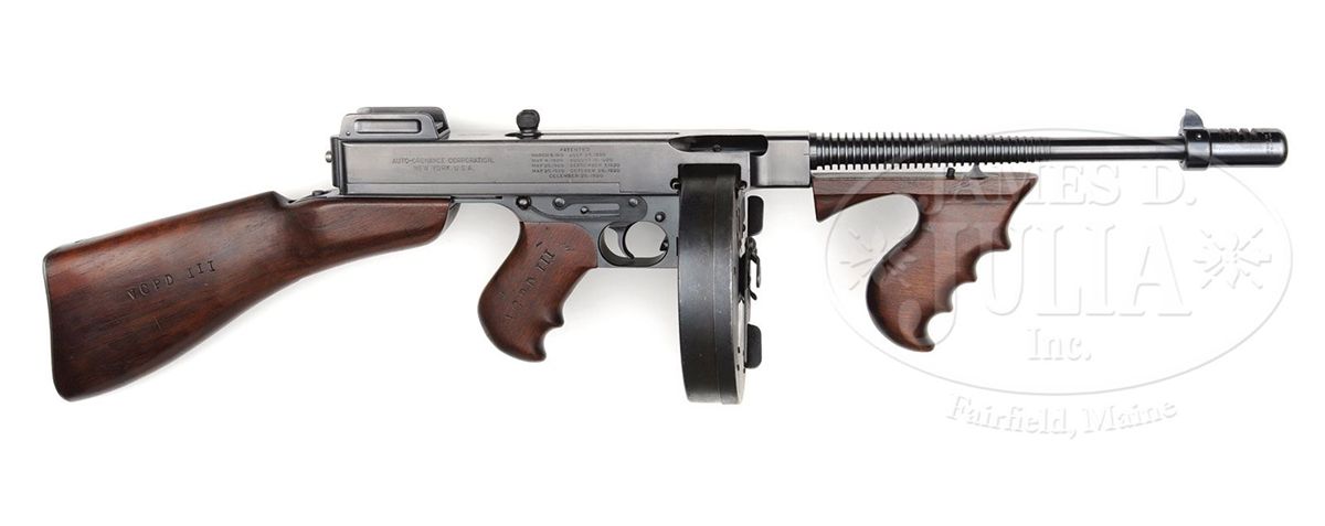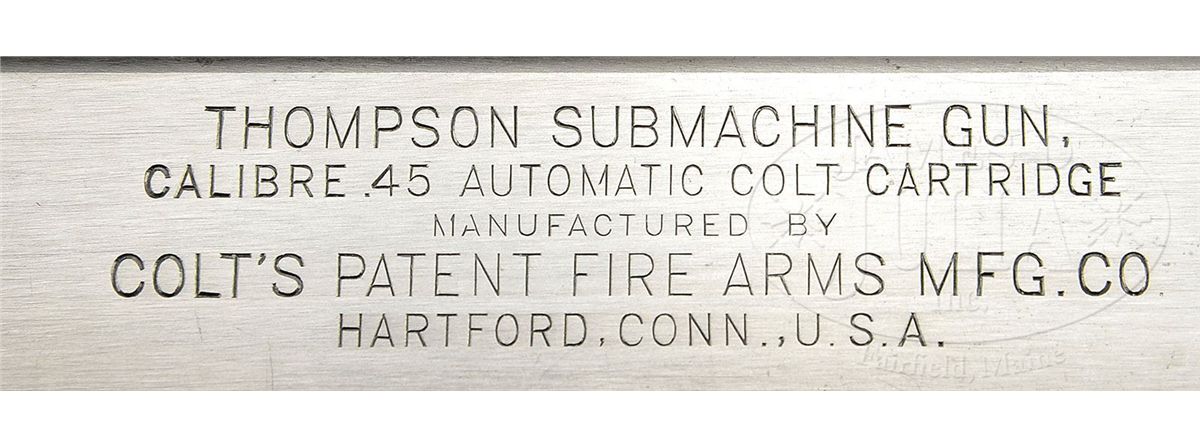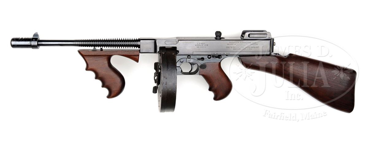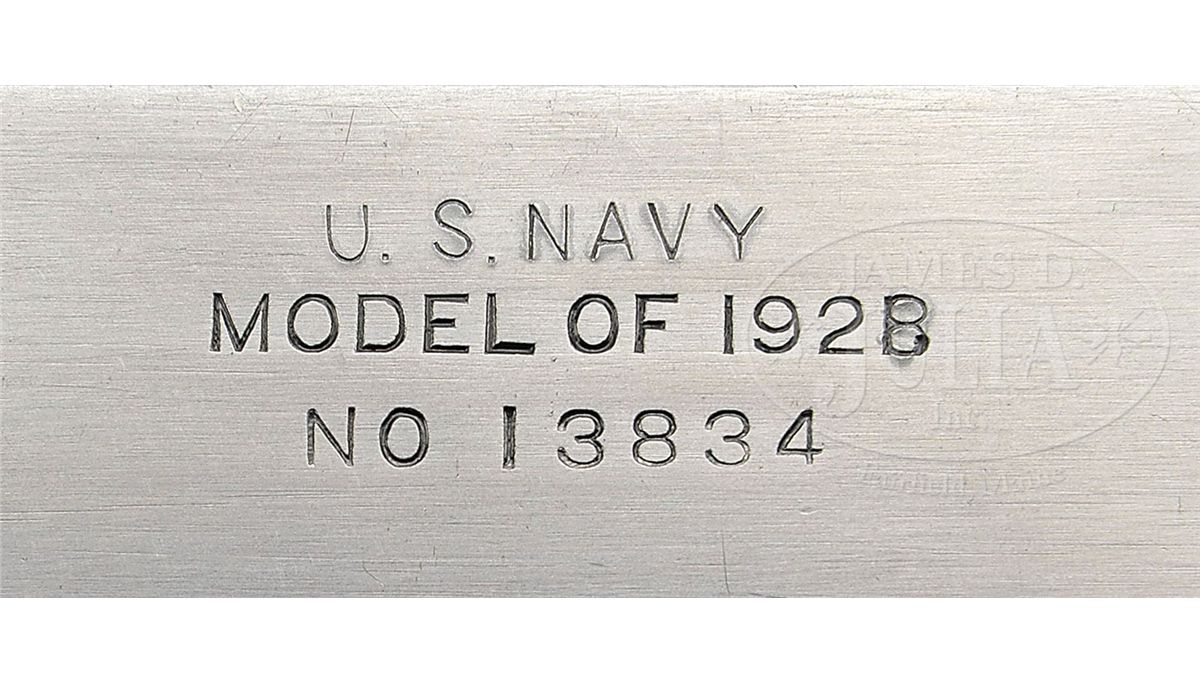 SN 13834. Cal. 45 ACP, 13.5" bbl. This is a fantastic U.S. Navy marked "over stamp" Thompson with a vertical forend which includes one 20 rnd Seymour magazine & one 30 rnd magazine marked "SW CO" and also one 50 rnd drum, marked "AUTO-ORDNANCE CORP BRIDGEPORT, CONNECTICUT REGISTERED IN THE U.S. PATENT OFFICE". Also included is one steel cleaning rod with a brass tip. This gun has orig 1928 internal parts. This gun is marked on the right side of the buttstock & on the handgrip "ACPD III", for Atlantic City Police Department. Cutts compensator is marked with Cutts, name within box logo at top near muzzle with patent dates. Buttstock has a small Navy anchor marking on the wood just below the hardware when viewed from the front. This gun is documented as being a Navy over stamp in mint condition in the book compiled by Gordon Herigstad. On the buttstock the "A" from "ACPD III" was applied upside down. The firing mechanism functions smoothly when operated by hand. This weapon appears fully functional. PROVENANCE: The estate of a Private Collector. CONDITION: Overall finish & appearance is absolutely outstanding. Deep lustrous orig blued finish with the slightest loss where cocking handle touches the receiver. There is also some slight loss of finish on the hardware of the buttstock where it slides onto the receiver. There is also loss of finish on the high points of the buttplate and the finish is only slightly thinning on the flat of it. The condition of the wood is fantastic with only the slightest of handling marks. The bore is excellent, shiny & bright. Bolt face is excellent. The 20 rnd magazine is in excellent condition with 95% of its deep lustrous finish remaining. The other stick mag is just as nice. The drum magazine also retains about 90% of its orig finish, thinning in places with some spots of corrosion. This is without a doubt the finest example of a Navy over stamp Thompson this cataloger has ever seen. 4-49207 JWK41