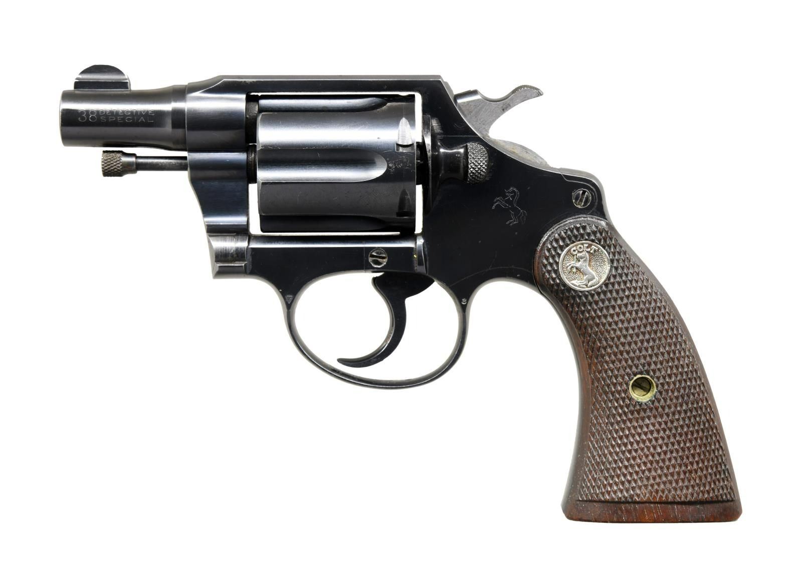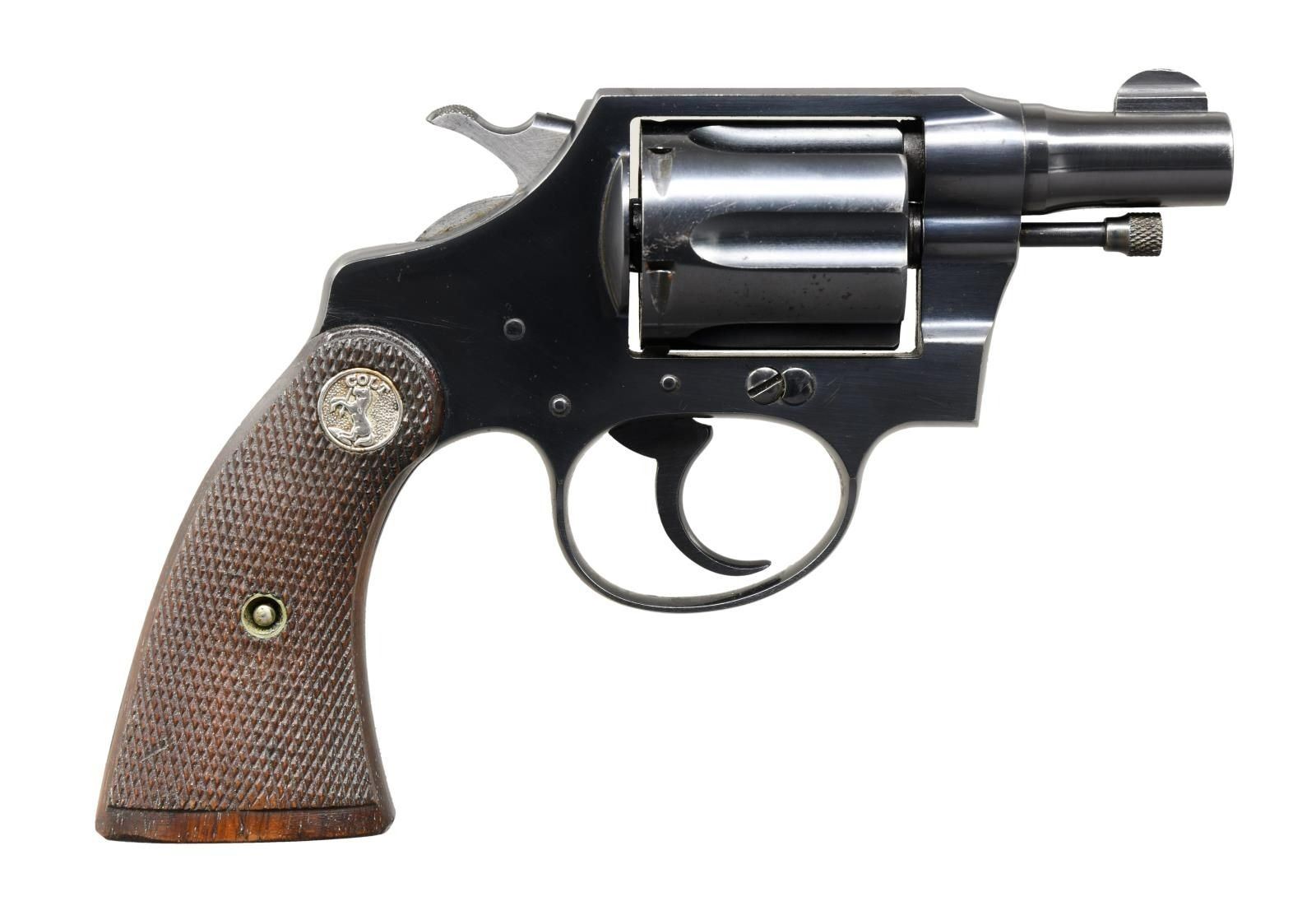 Cal. 38 Spl. S# 358909. Bbl. 2" with integral semi circular sight; frame notched rear. Mfg. 1928 (1927-1946) with blued finish, no ejector rod shroud plus square butt grip frame (through 1932, then round beginning 1933) having unnumbered factory checkered walnut stocks with silver Colt medallions. Smooth / serrated top strap, blued trigger and sides of hammer in the white. UNATTACHED ACCESSORIES: w/box. CONDITION: very good to near excellent overall with original finish. Small areas of faint pinprick oxidation along with two very faint areas on smooth section of top strap. Very good to excellent grips with miniscule handling marks; near excellent bore. PROVENANCE: The Collection of Gun Sport Ltd owned by Jon R. Thomas. (23-3929/NW). CURIO. $700-1,000.