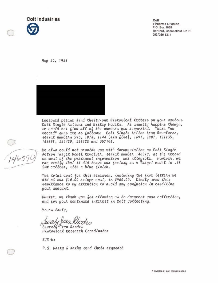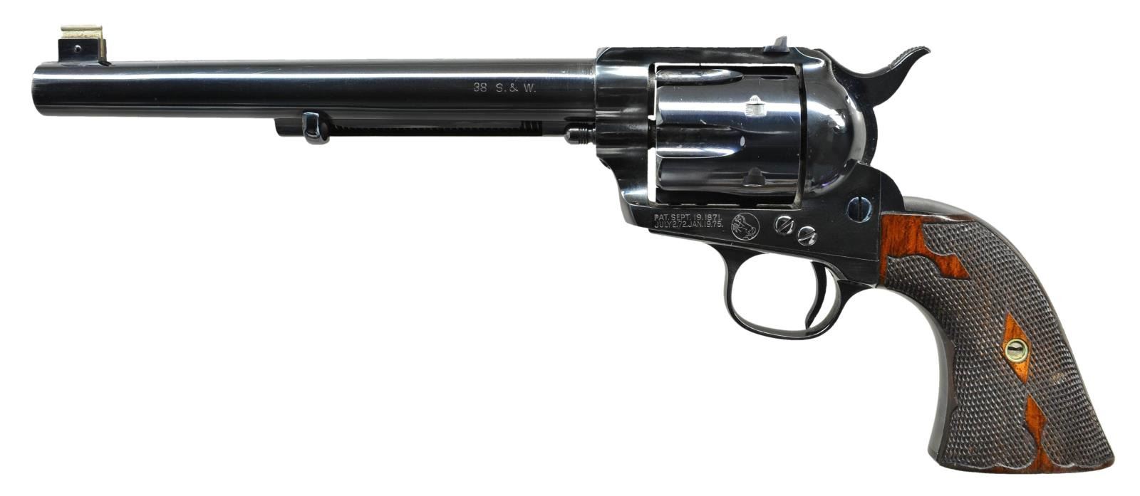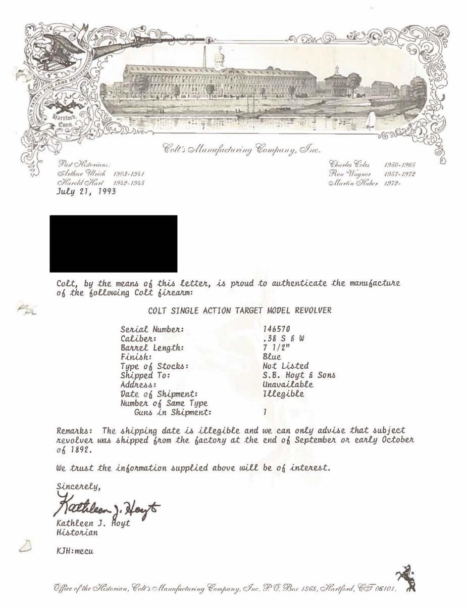 Cal. 38 S&W, a scarce chambering. S# 146570, Bbl. 7-1/2" with Hartford address. Dovetail mounted square notch rear sight with German silver beaded blade front. 6 shot fluted cyl. Full blue finish. Checkered walnut 2 piece grips. Very desirable SAA variation. Approx. 925 mfg 1888-1896.Serial number of this revolver indicates 1892 mfg. UNATTACHED ACCESSORIES: Colt Historian letter stating: "Colt Single Action Target Model Revolver / Serial number: 146570 / Caliber .38 S&W / Barrel Length: 7 1/2" / Finish: Blue / Type of Stocks: Not listed / Shipped To: S.B. Hoyt & Sons / Address: Unavailable / Date of shipment: 1