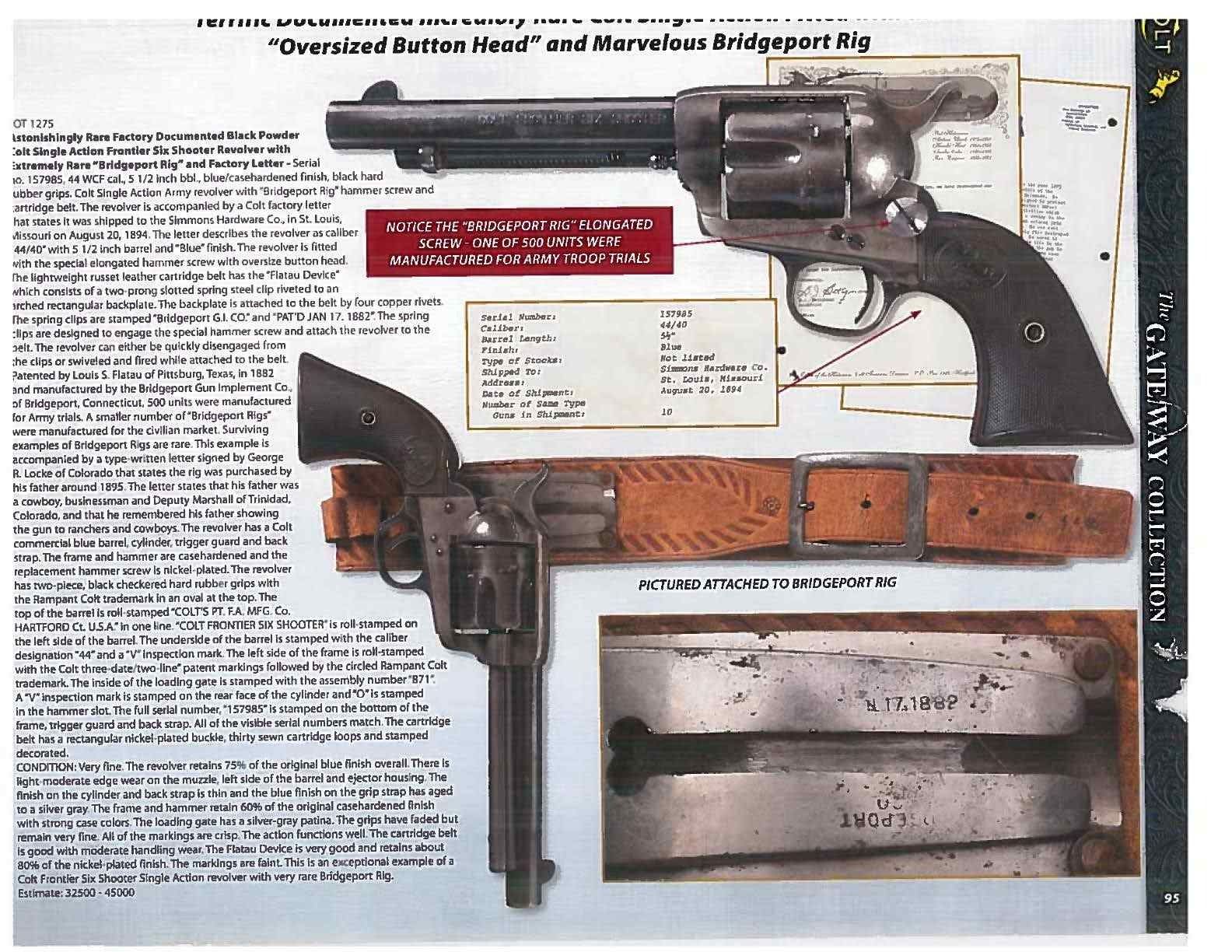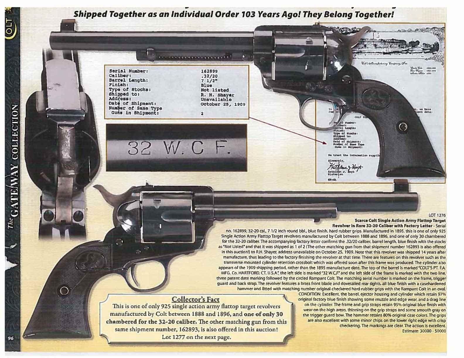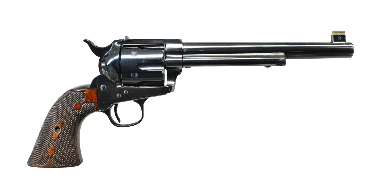 Cal. 38 S&W, a scarce chambering. S# 146570, Bbl. 7-1/2" with Hartford address. Dovetail mounted square notch rear sight with German silver beaded blade front. 6 shot fluted cyl. Full blue finish. Checkered walnut 2 piece grips. Very desirable SAA variation. Approx. 925 mfg 1888-1896.Serial number of this revolver indicates 1892 mfg. UNATTACHED ACCESSORIES: Colt Historian letter stating: "Colt Single Action Target Model Revolver / Serial number: 146570 / Caliber .38 S&W / Barrel Length: 7 1/2" / Finish: Blue / Type of Stocks: Not listed / Shipped To: S.B. Hoyt & Sons / Address: Unavailable / Date of shipment: 1
