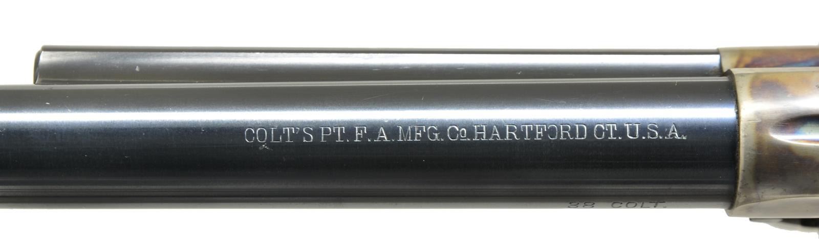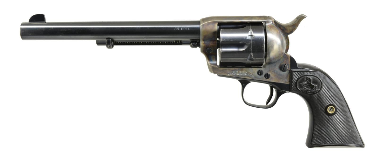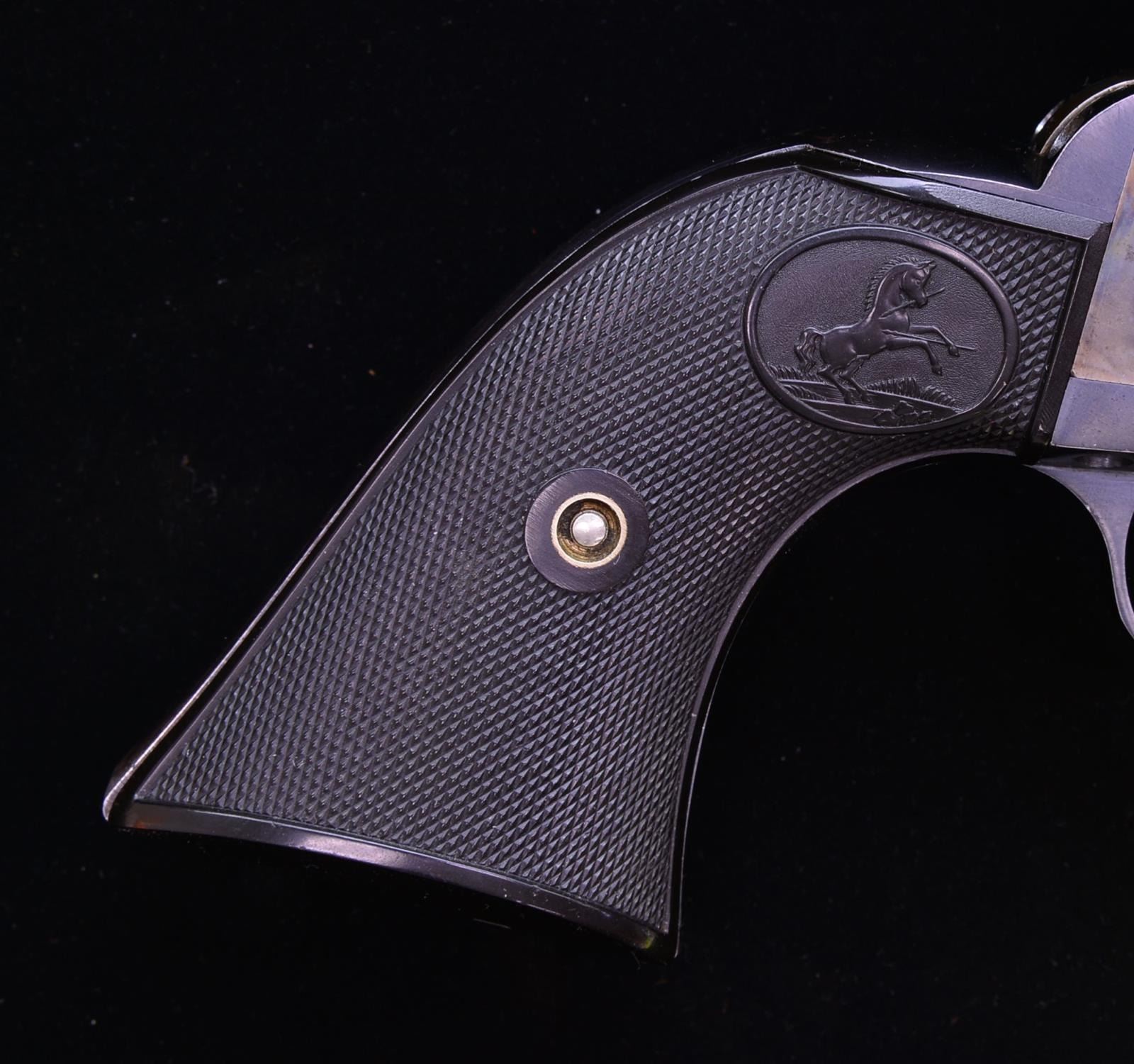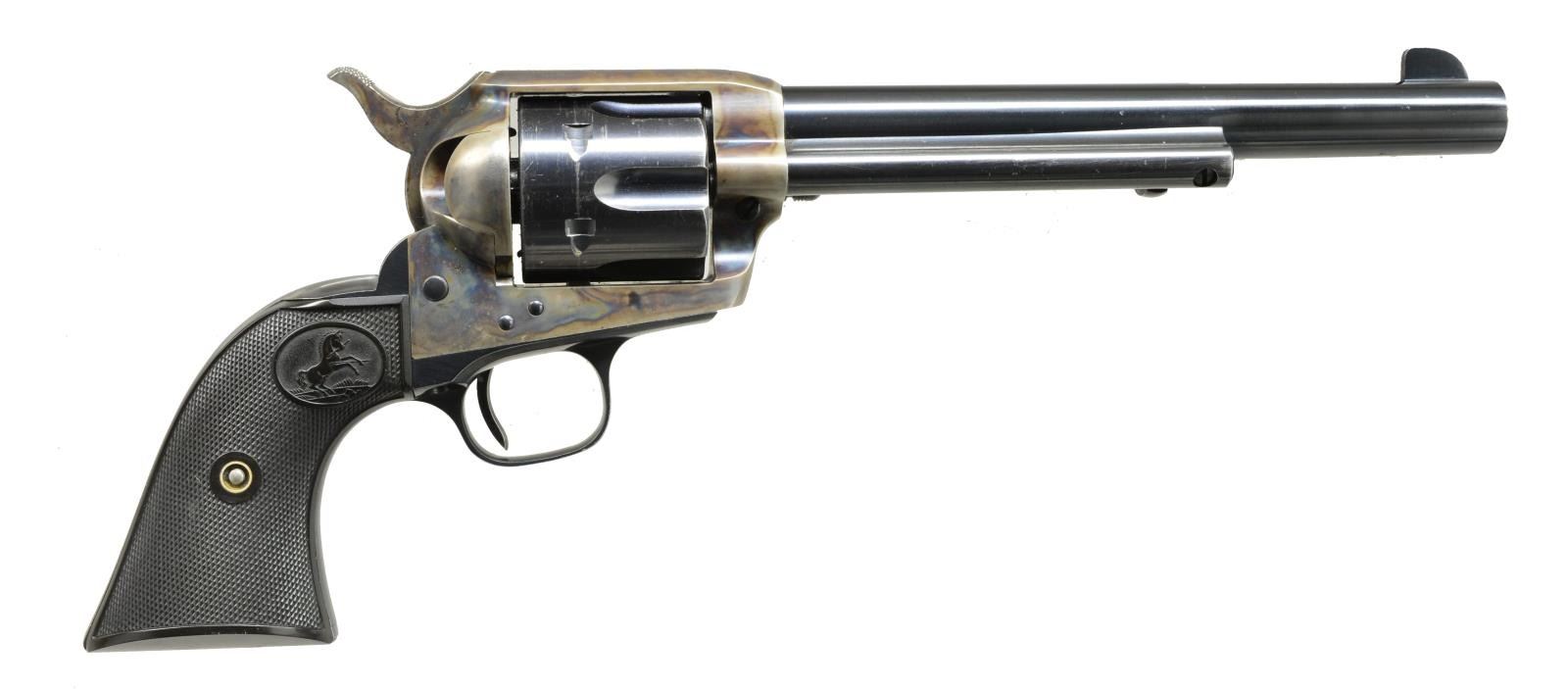 Cal. 38 Colt. S# 350360. Bbl. 7 1/2". 6 Shot fluted cyl. Blue finish w/ case colored frame & hammer. 2 Piece checkered hard rubber Rampant Colt grips. 1927 Mfg. CONDITION: bbl., cyl. & grip straps retain over 80% lightly faded blue showing sm. handling marks & cyl. drag line. Frame & hammer retain 90% lightly faded case colors showing spots of freckling. Grips show light wear. Bright bore w/ strong rifling. PROVENANCE: Collection of Alan Bradley Shepherd. (20-4026/DS). CURIO. $3,000-4,000.