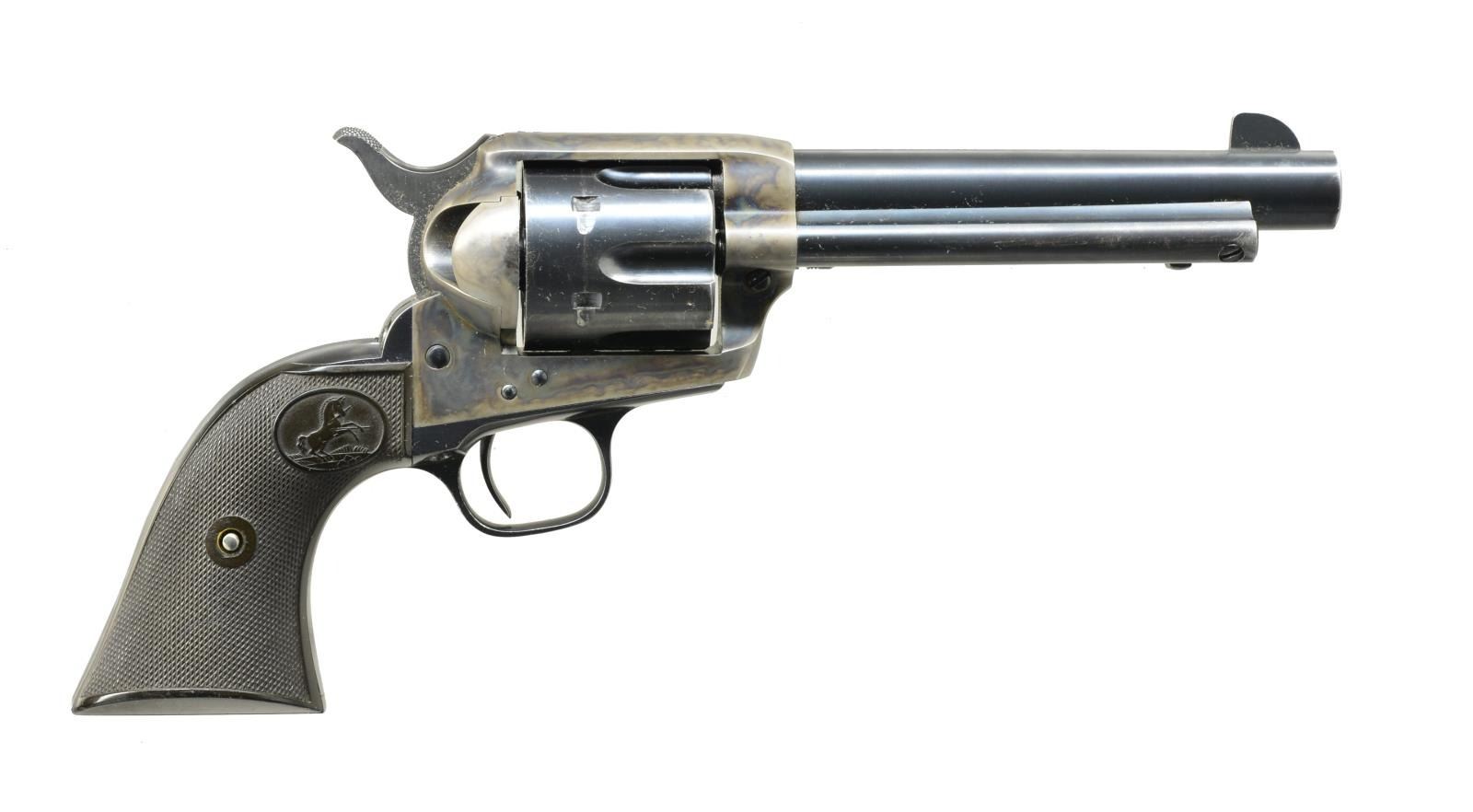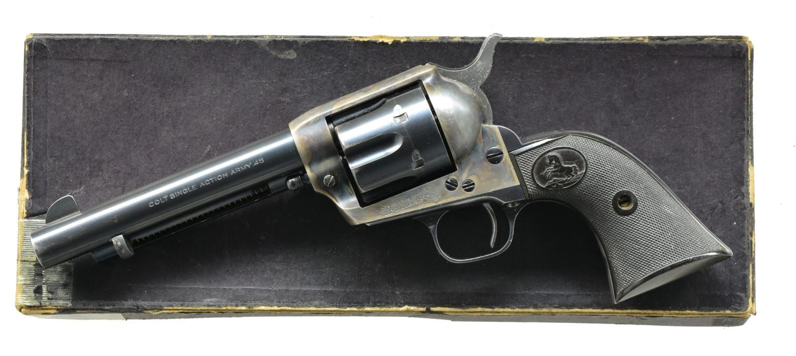 Cal. 45 Colt. S# 356506. Bbl. 5 1/2" w/ blade front sight. 6 Shot fluted cyl. Blue finish w/ case colored frame. 2 Piece checkered hard rubber Rampant Colt grips. 1936. Mfg. UNATTACHED ACCESSORIES: 1 piece box w/ proper label having S# on bottom. Box contains article from July 1979 American Rifleman "The Dilemma of Colt's Single Action", spare parts including ejector rod, bolt, sear & spring, brass cleaning rod & brushes. Box shows tattering w/ 1 torn & taped corner. CONDITION: bbl., cyl. & grip straps retain 75% lightly faded blue showing muzzle edge & grip strap wear. Frame retains 90% lightly faded case colors w/ spot of corrosion on loading gate. Grips show light wear & handling marks. Bore is bright w/ strong rifling. (20-4094/DS). CURIO. $2,000-3,000.