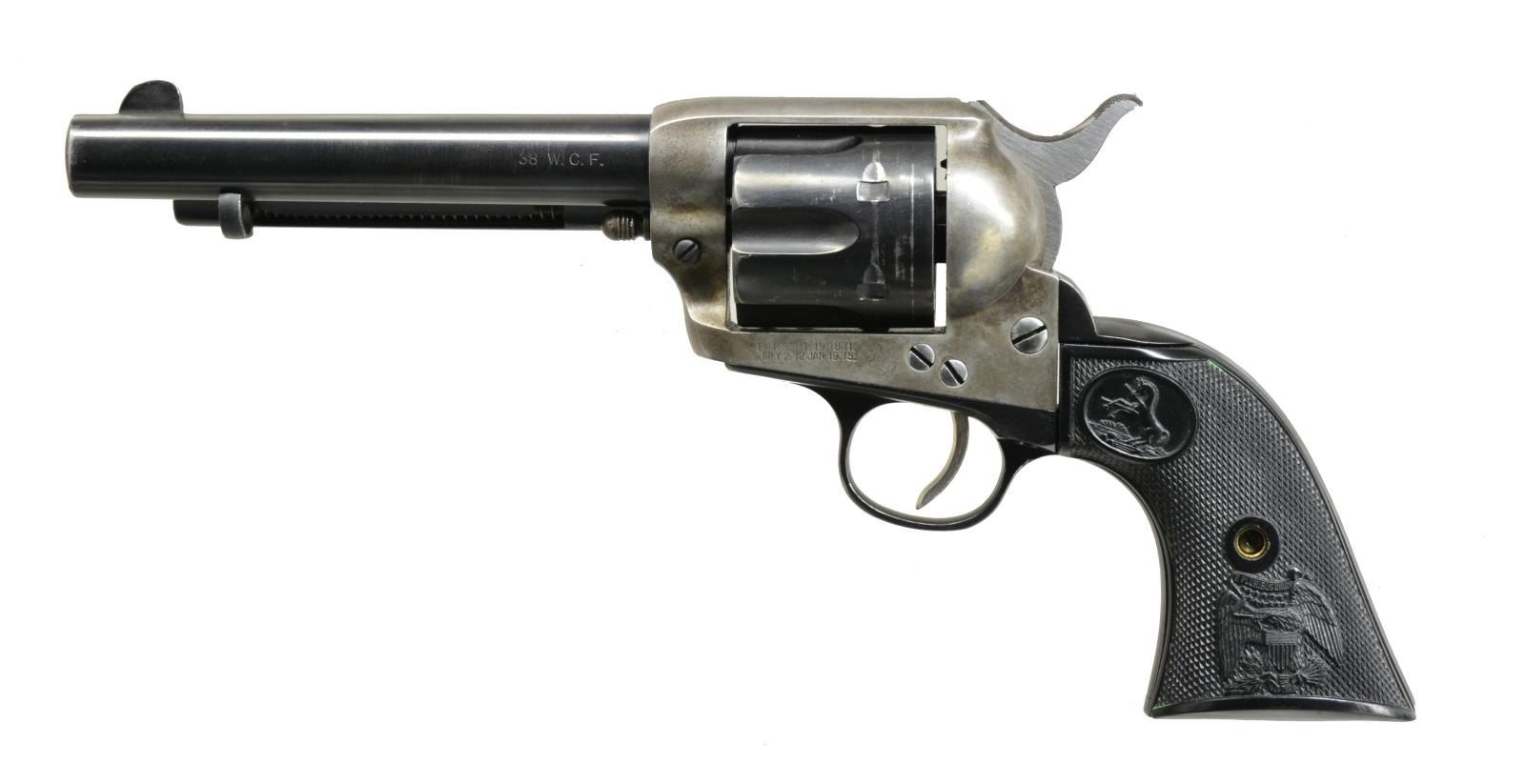 Cal. 38 WCF. S# 244630. Bbl. 5 1/2". 6 Shot fluted cyl. Blue finish w/ case colored frame & hammer. 2 Piece checkered eagle replacement grips. 1903 Mfg. CONDITION: bbl., cyl. & grip straps retain 70% lightly faded blue showing edge wear & cyl. drag line. Frame retains faint traces of case colors fading to gray. Sides of hammer are polished bright. Grips have fitting marks at butt. Good mechanics. Bore has darkened appearance w/ worn rifling showing spots of light pitting. PROVENANCE: Collection of Alan Bradley Shepherd. (20-4023/DS). CURIO. $1,500-2,000.